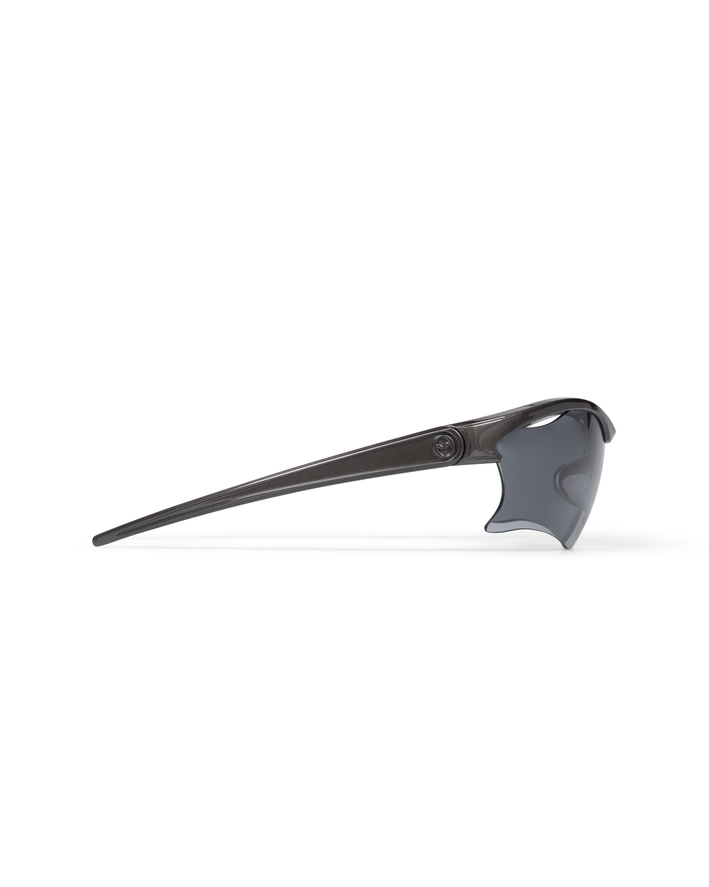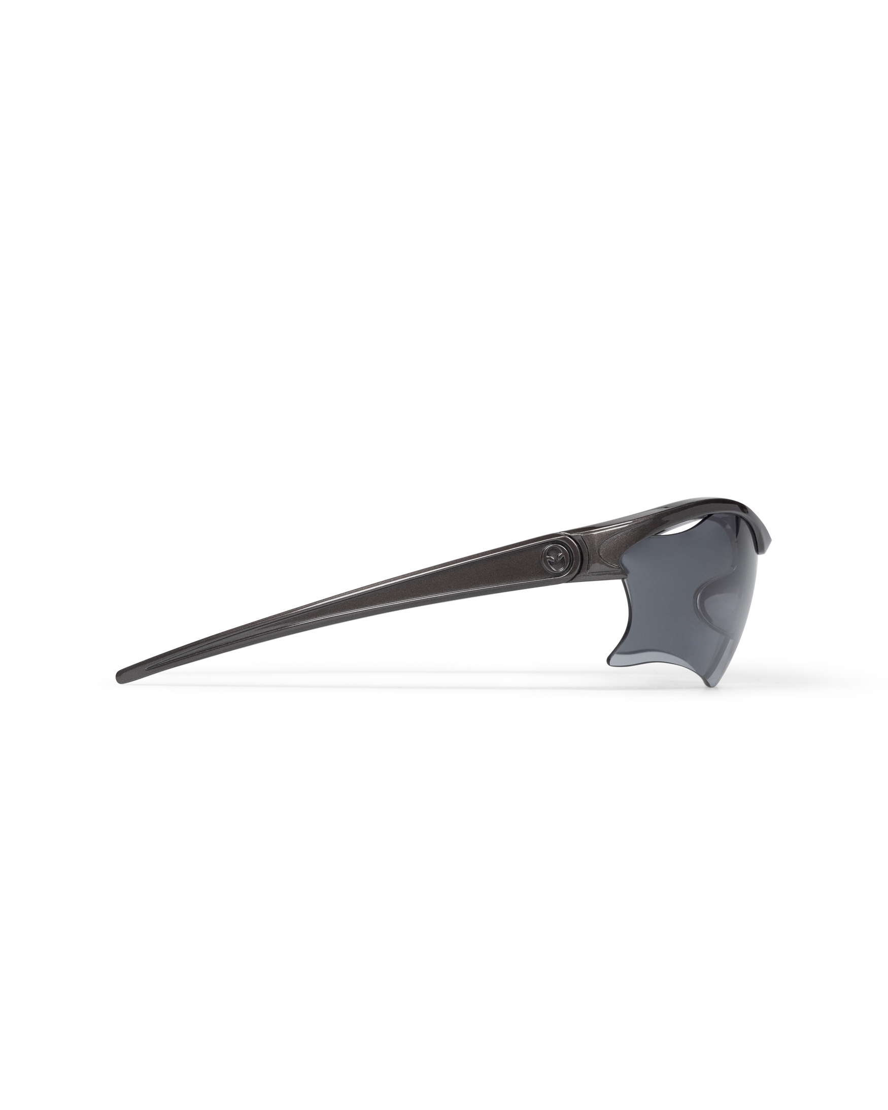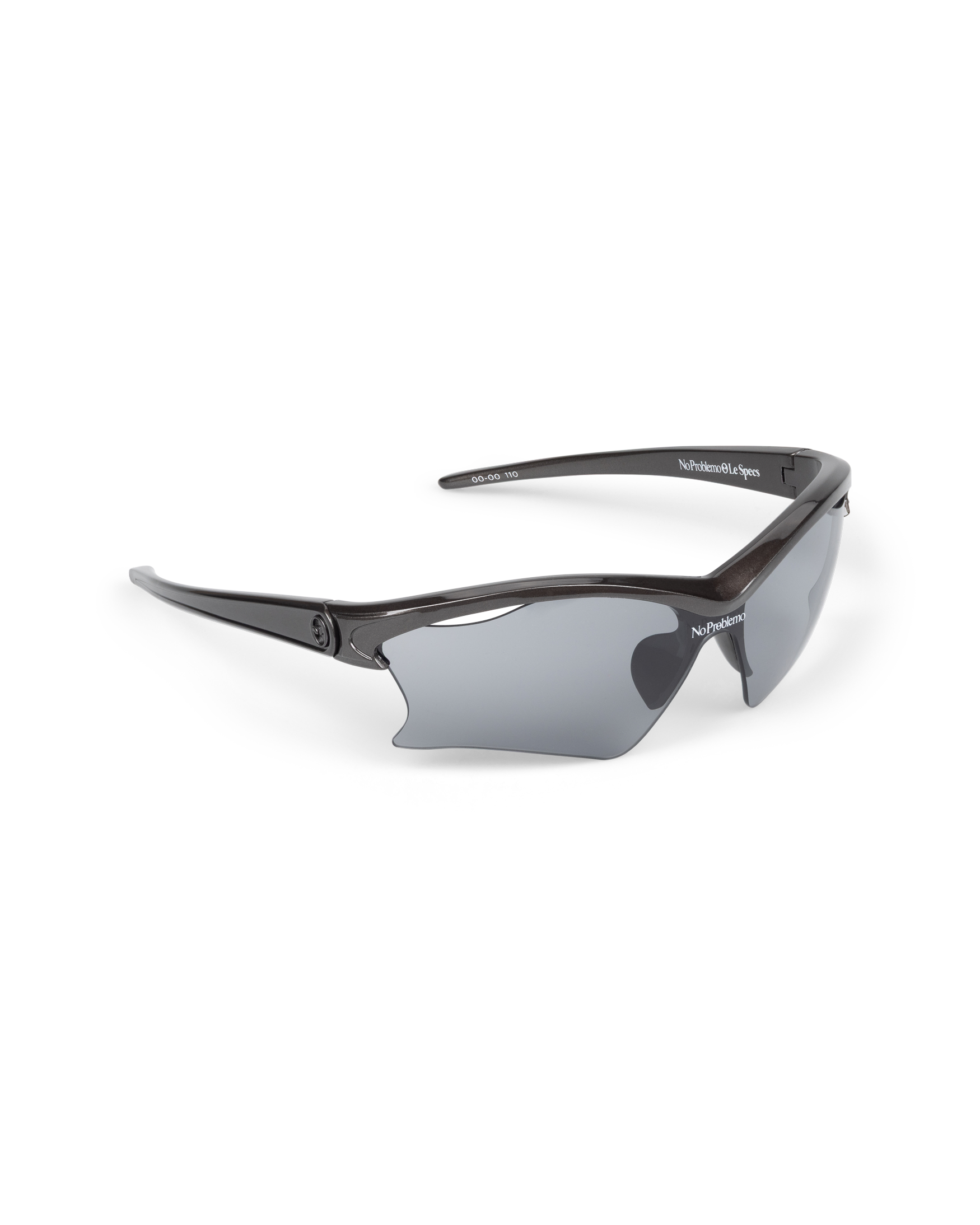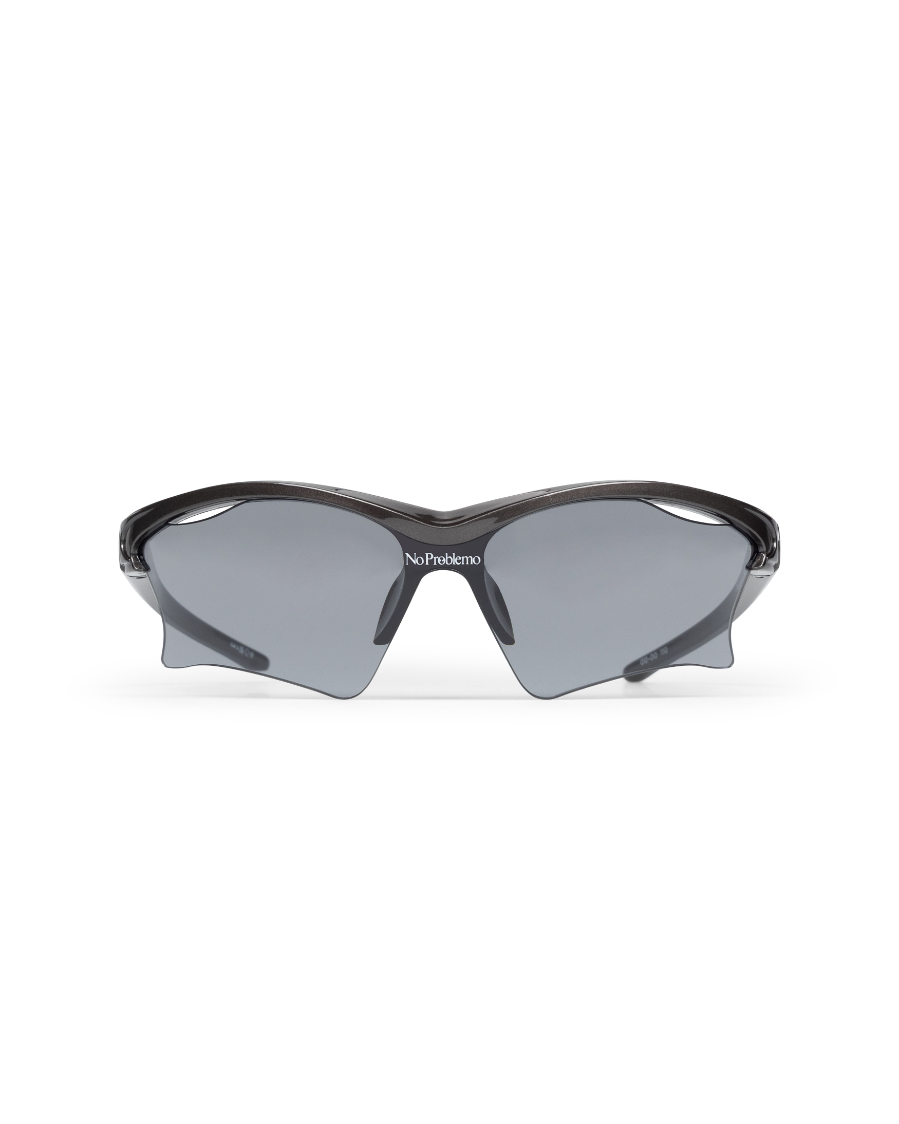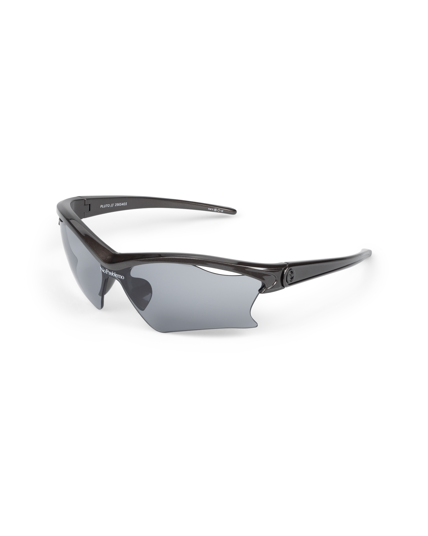 designed with sleek and sweeping proportions, the pluto wraparound semi rimless shield sunglasses are a modern update on the early 2000s racer style. featuring cut out lens accents and three dimensionally moulded frame profile with signature alien head motif embossed into temple, this frame is finished with signature no problemo logo lens print to centre front and tapered tubular temples for a comfortable fit.