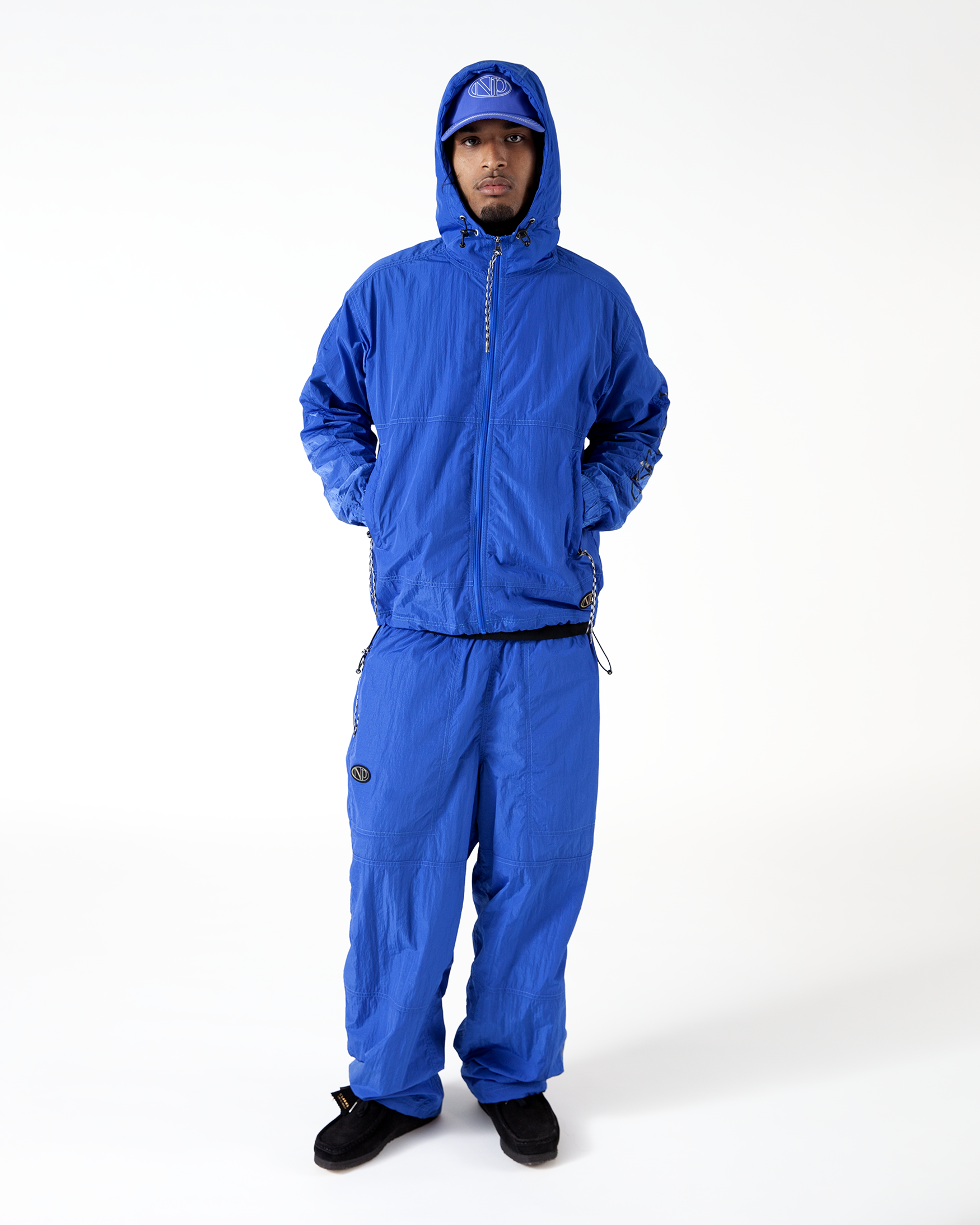 Unisex lightweight nylon track-pant with an elasticated waistband, ankle toggles, reinforced knees and side zipped pockets. With a holographic silicone brand patch, and No Problemo screen print down the side leg.