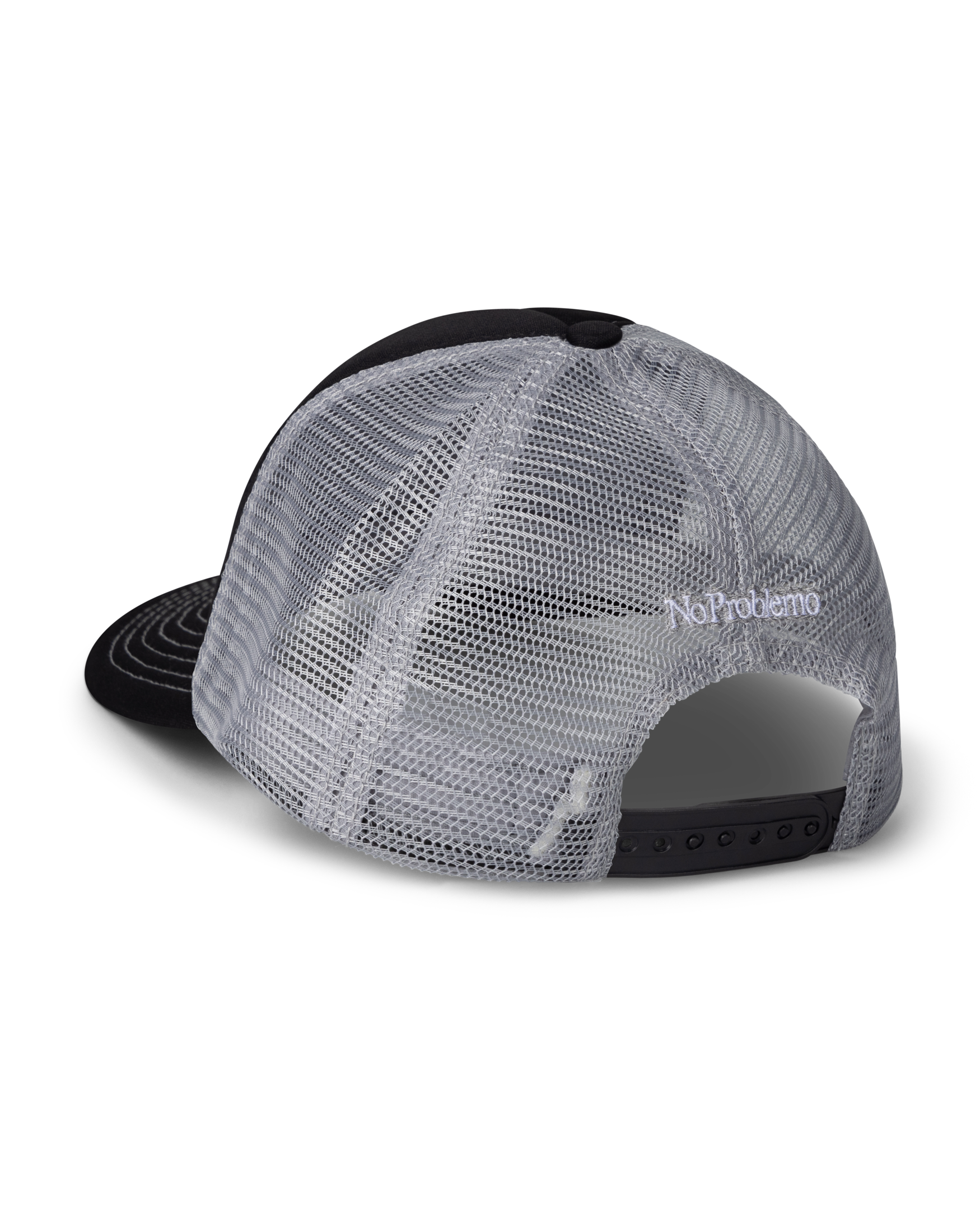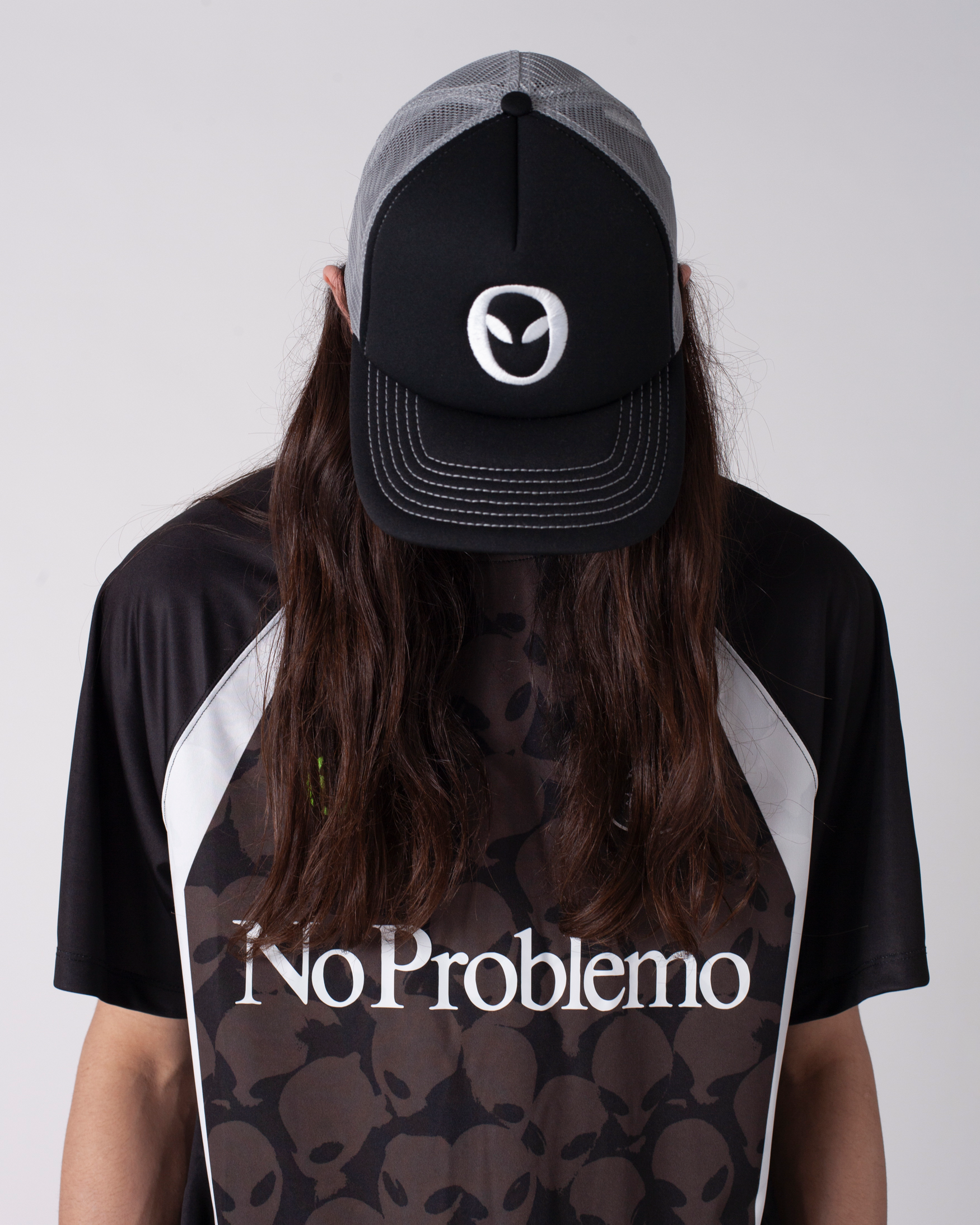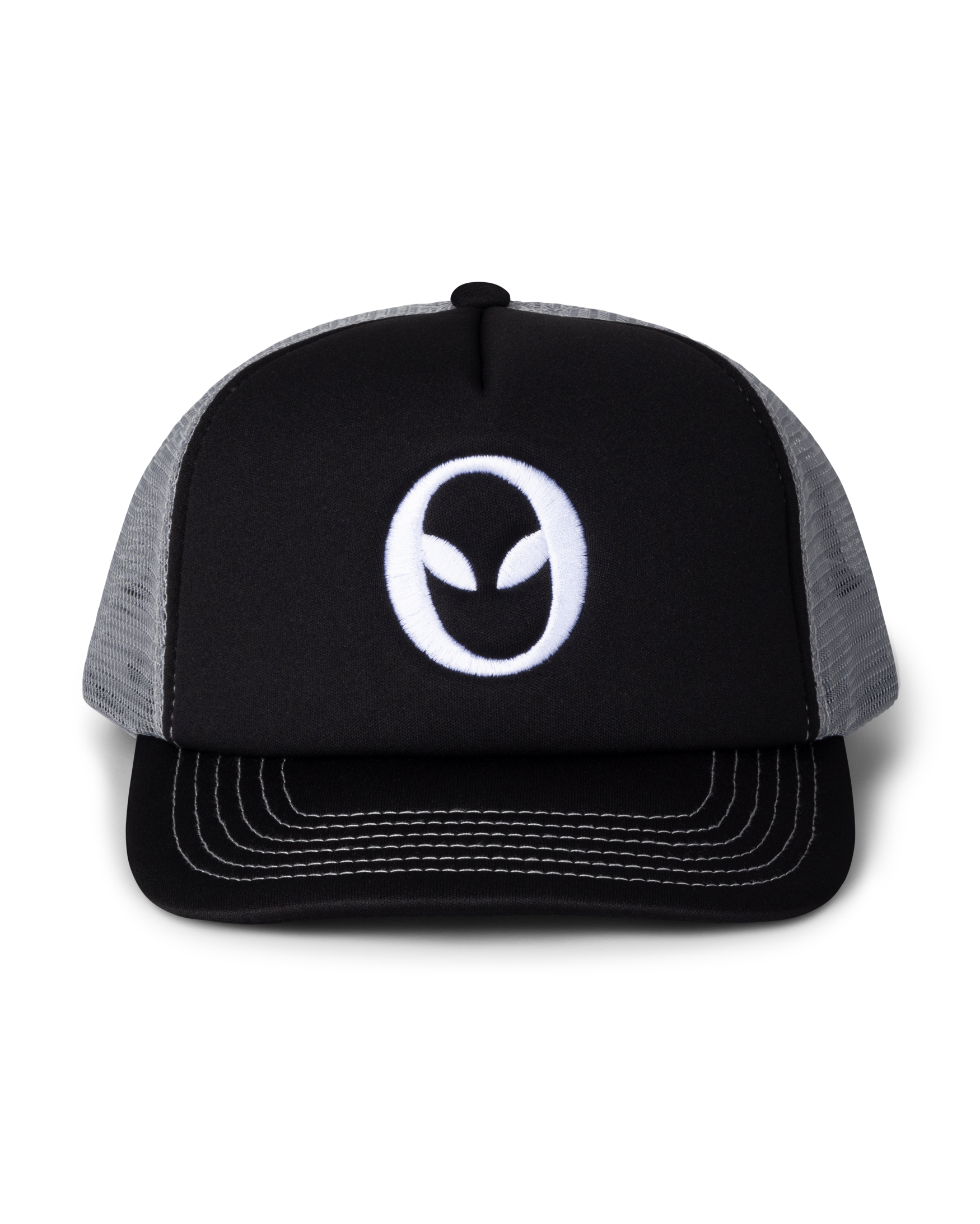 6 panel trucker cap made from 100% cotton and 100% polyester with a plastic back strap, featuring an alien-o front patch.