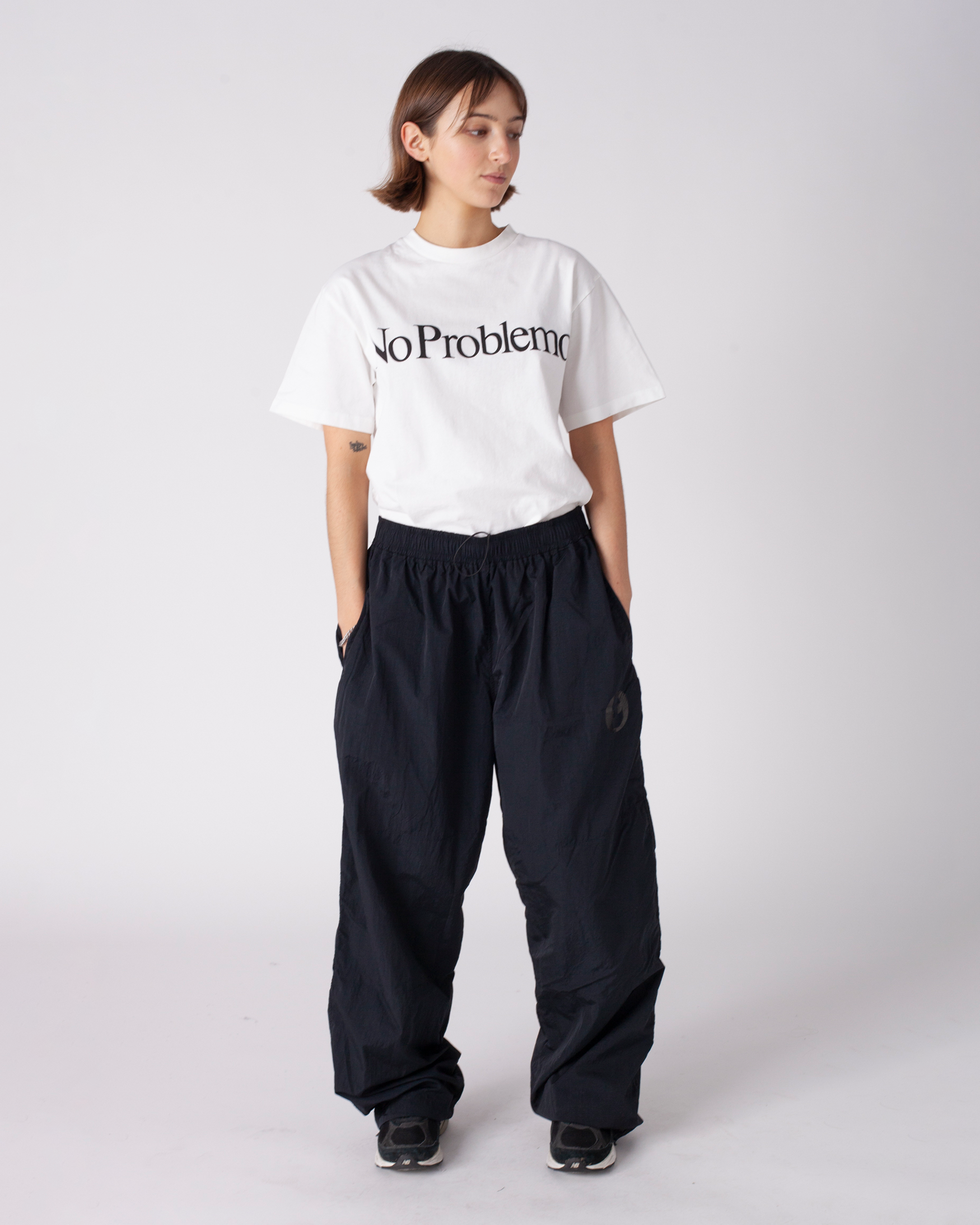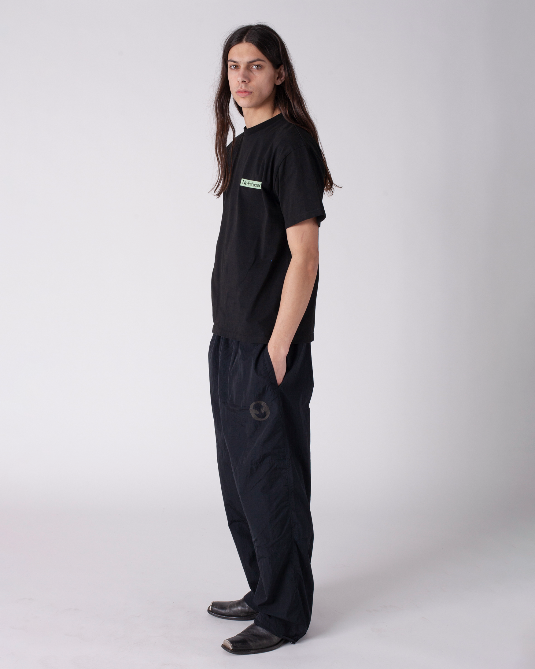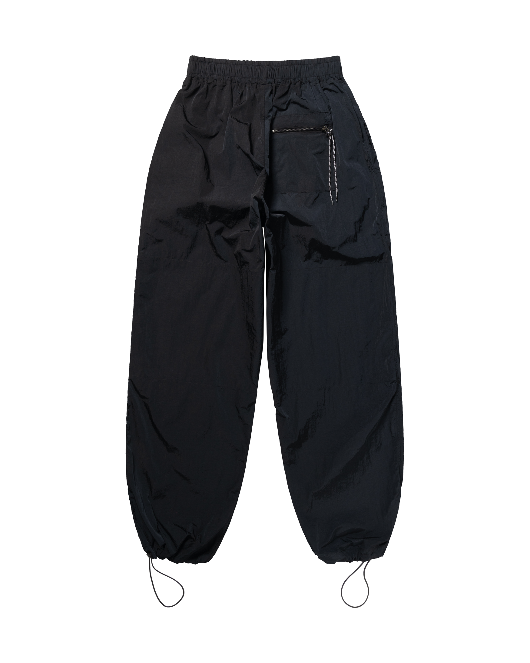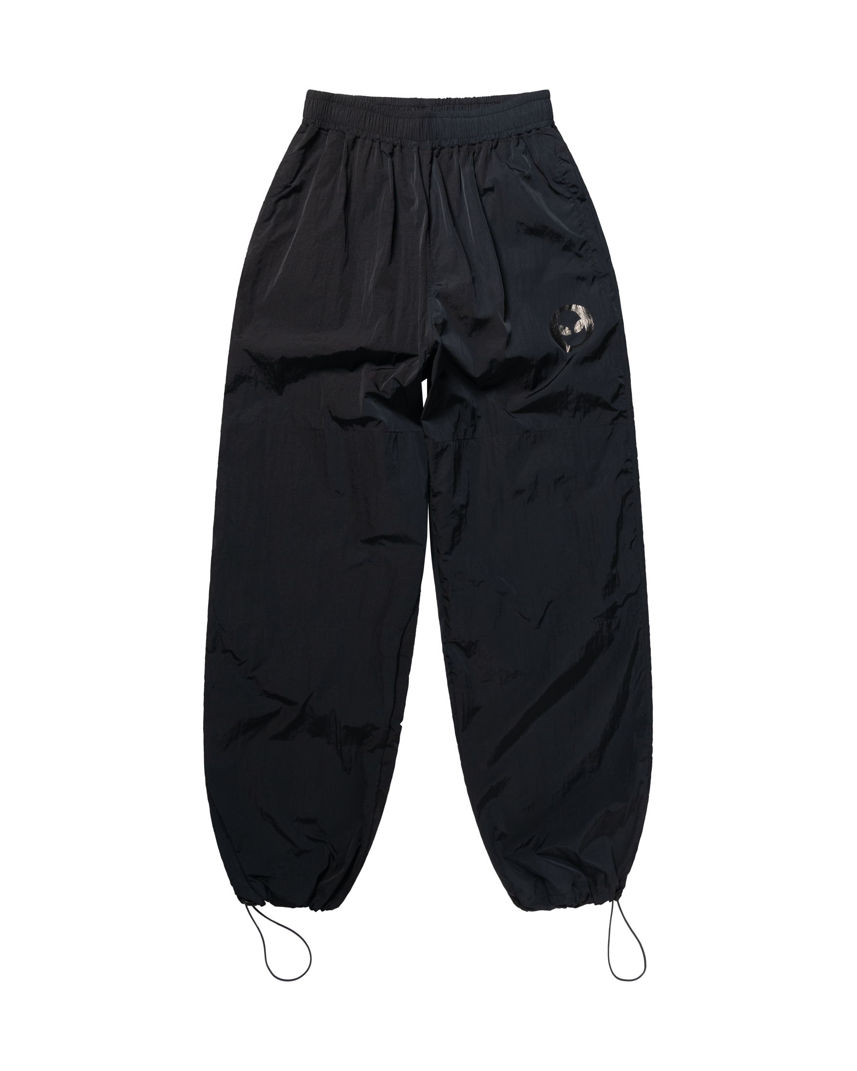 unisex lightweight trackpant in a black nylon fabric, with an elasticated waistband, ankle toggles, and a zip patch pocket on the back with glossy tonal alien-o graphic on the front.