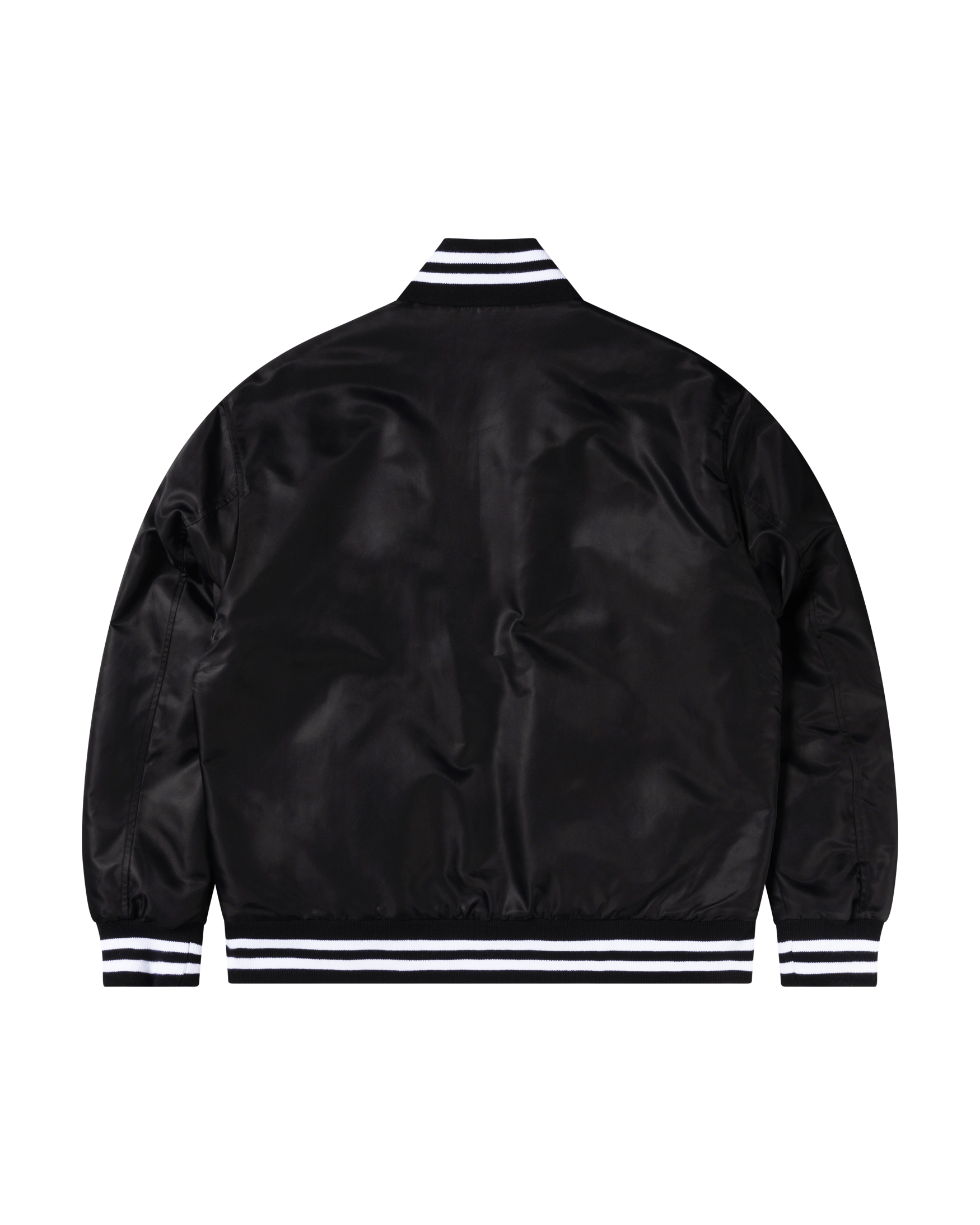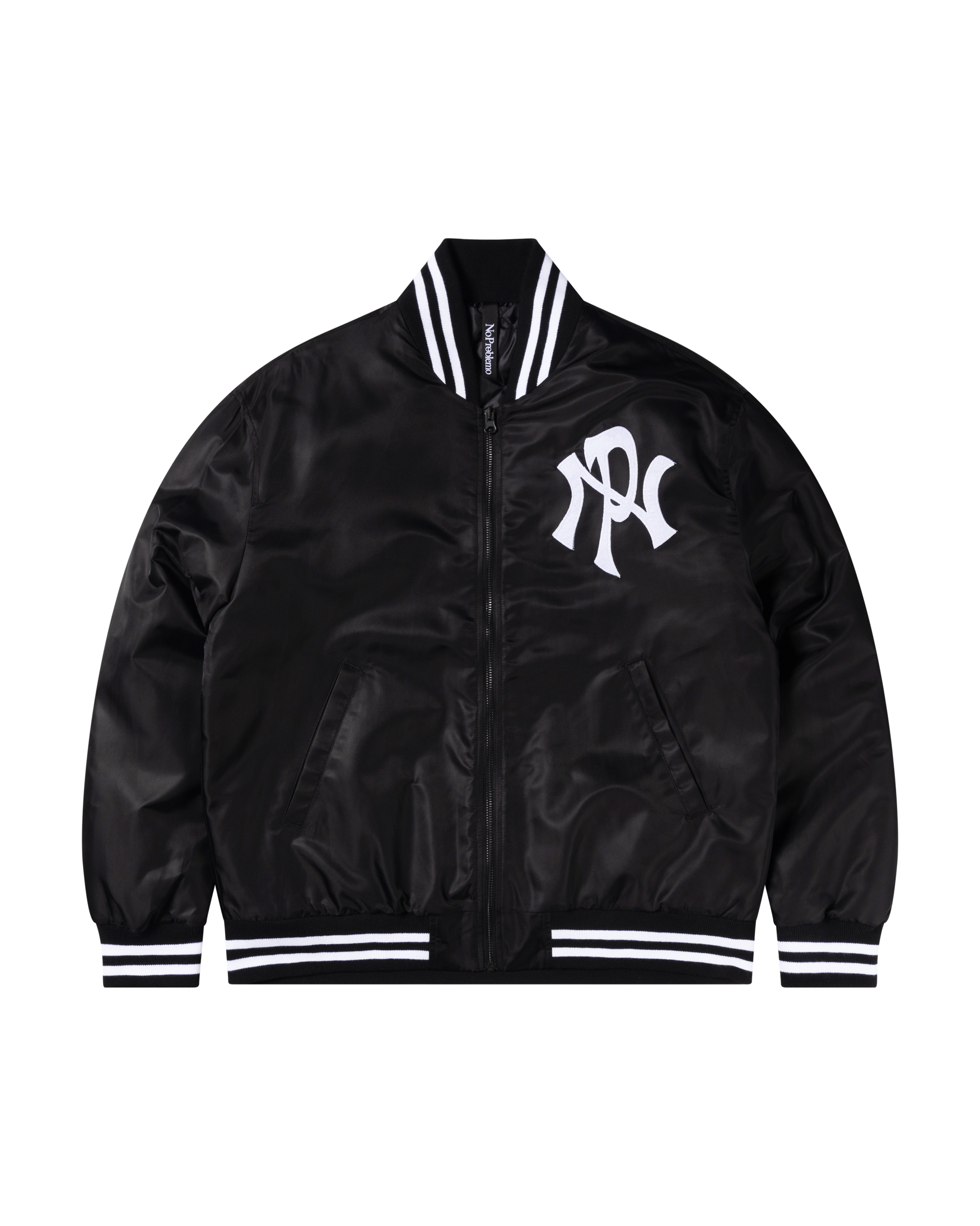 nylon bomber jacket with front zip closure and stripe cuffs, featuring front nyp print.