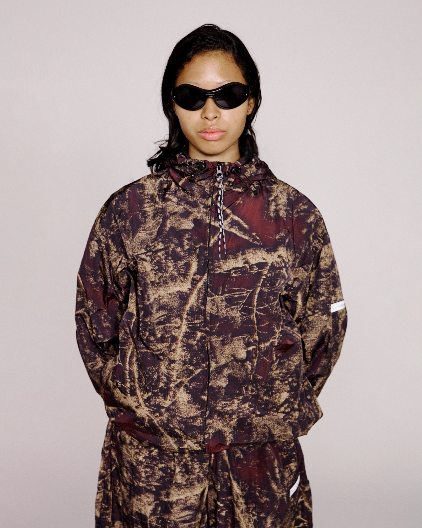 featuring a no problemo tree camo allover print and a reflective silicone brand patch.