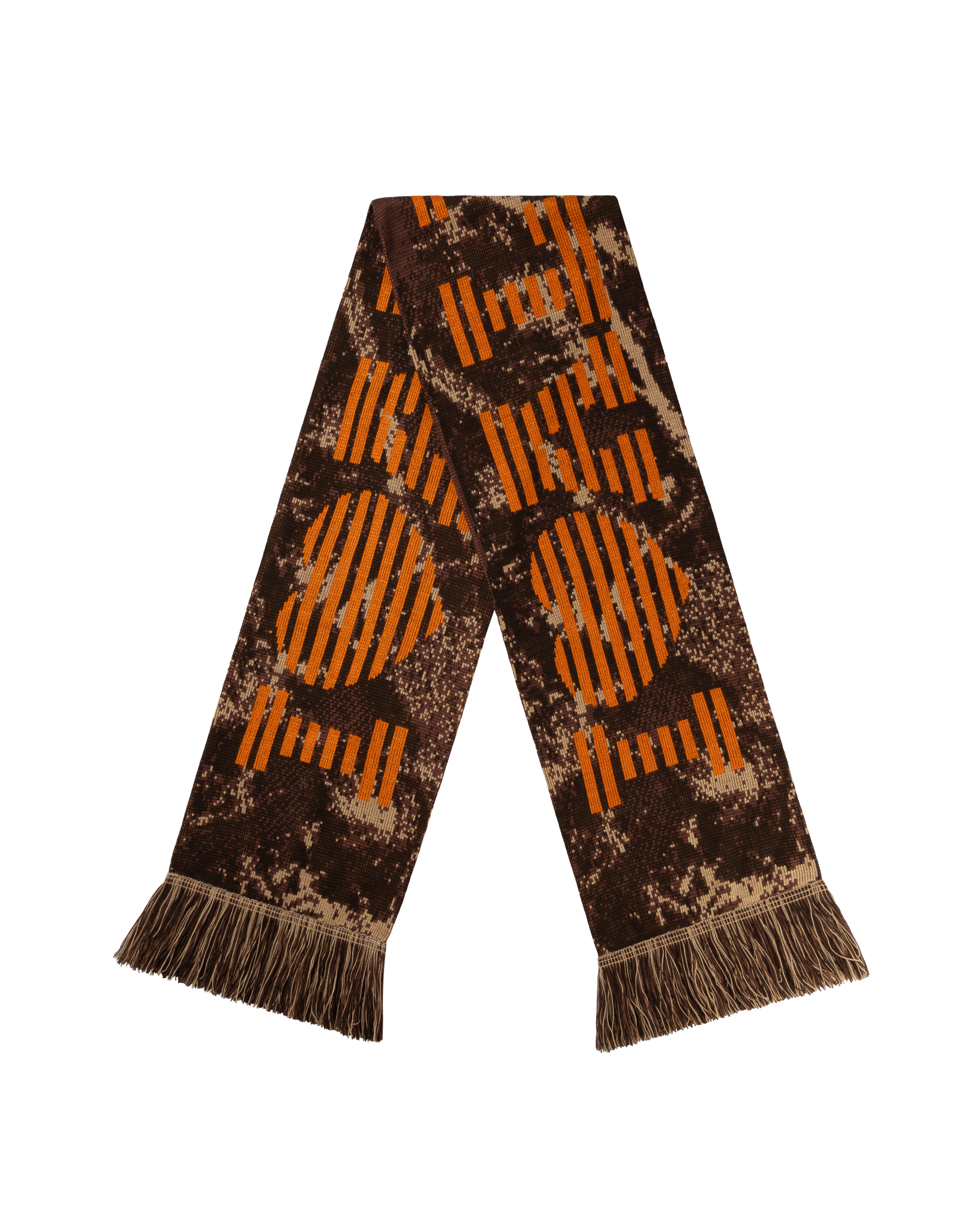 knitted acrylic football-style scarf with a i love alieno intarsia design and fringed ends.