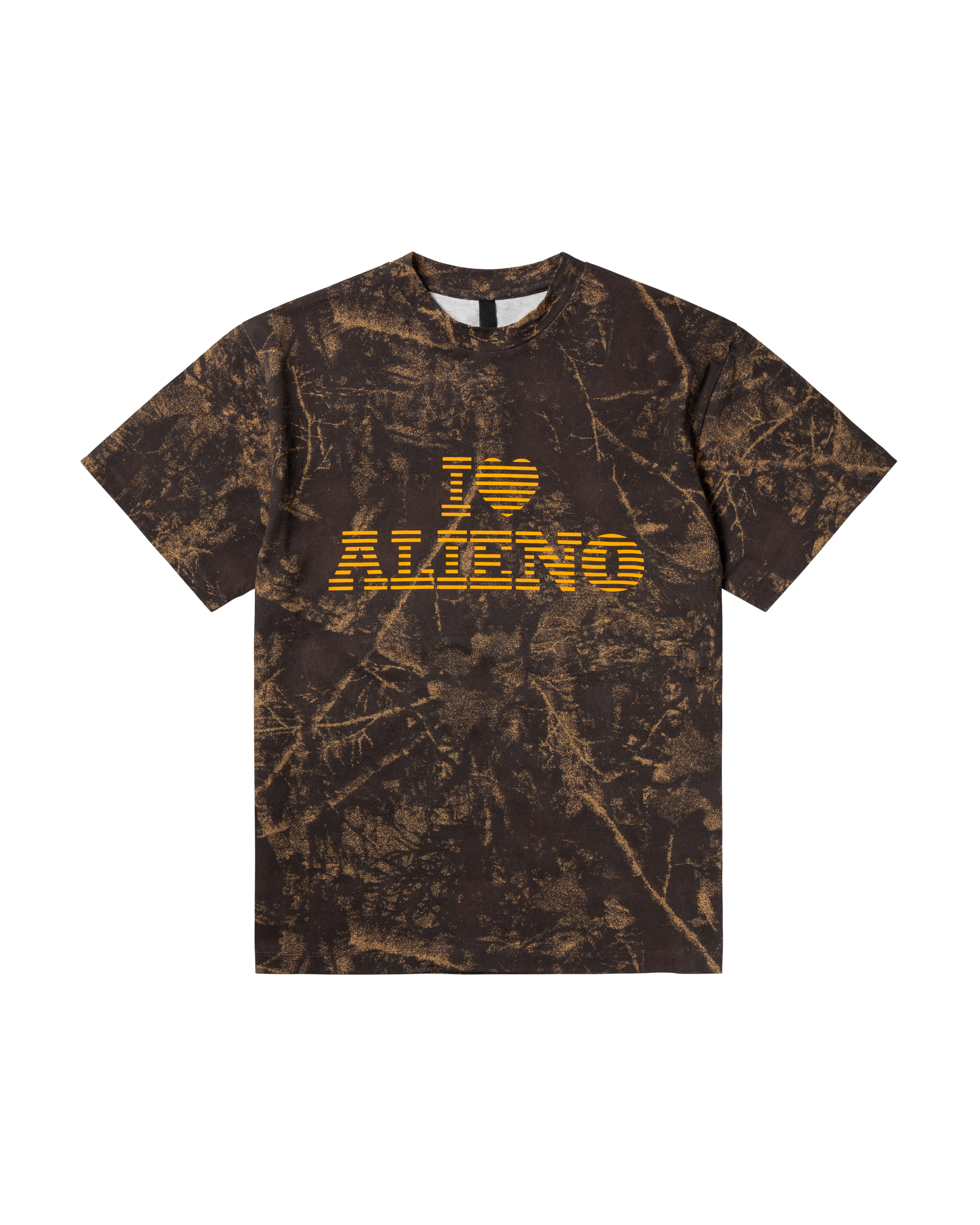 featuring 'i love alieno' graphic on the front and allover print no problemo real tree camo