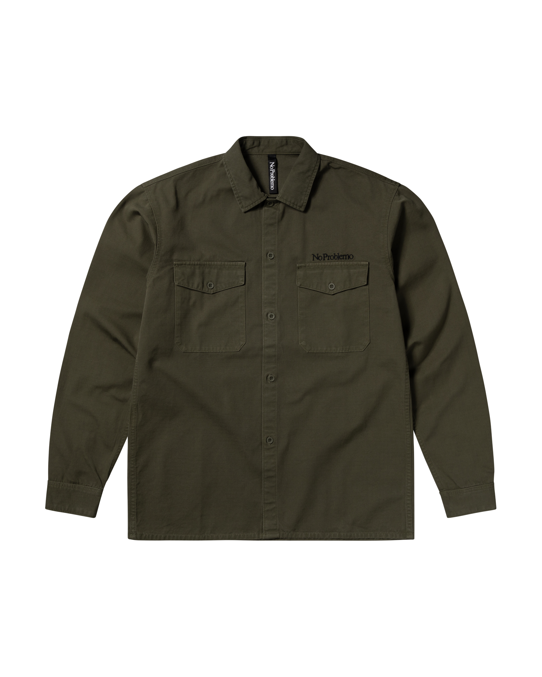 featuring a mini no problemo logo embroidered on the left pocket and a woven np patch on the centre front.