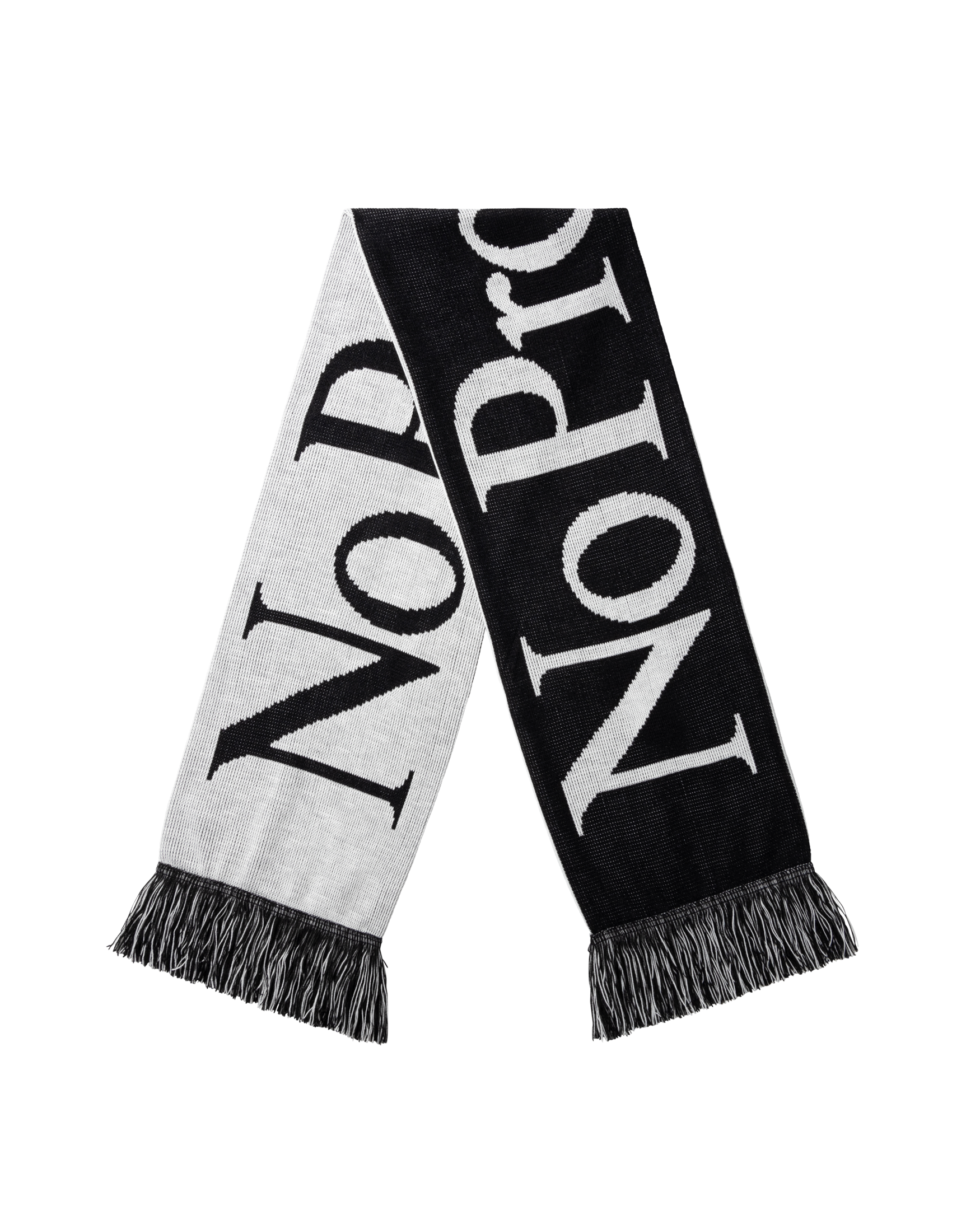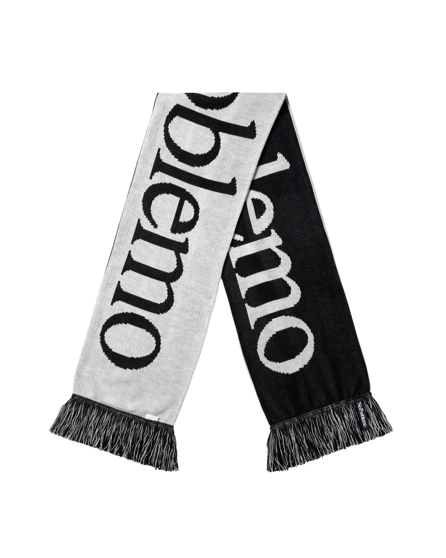 knitted acrylic football-style scarf with a no problemo intarsia design and fringed ends.