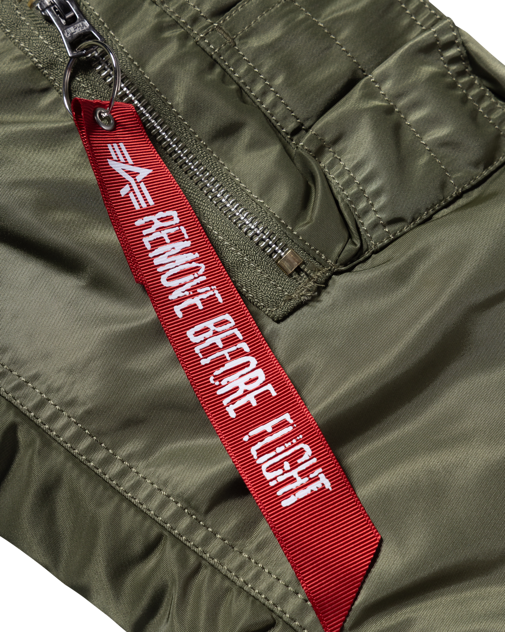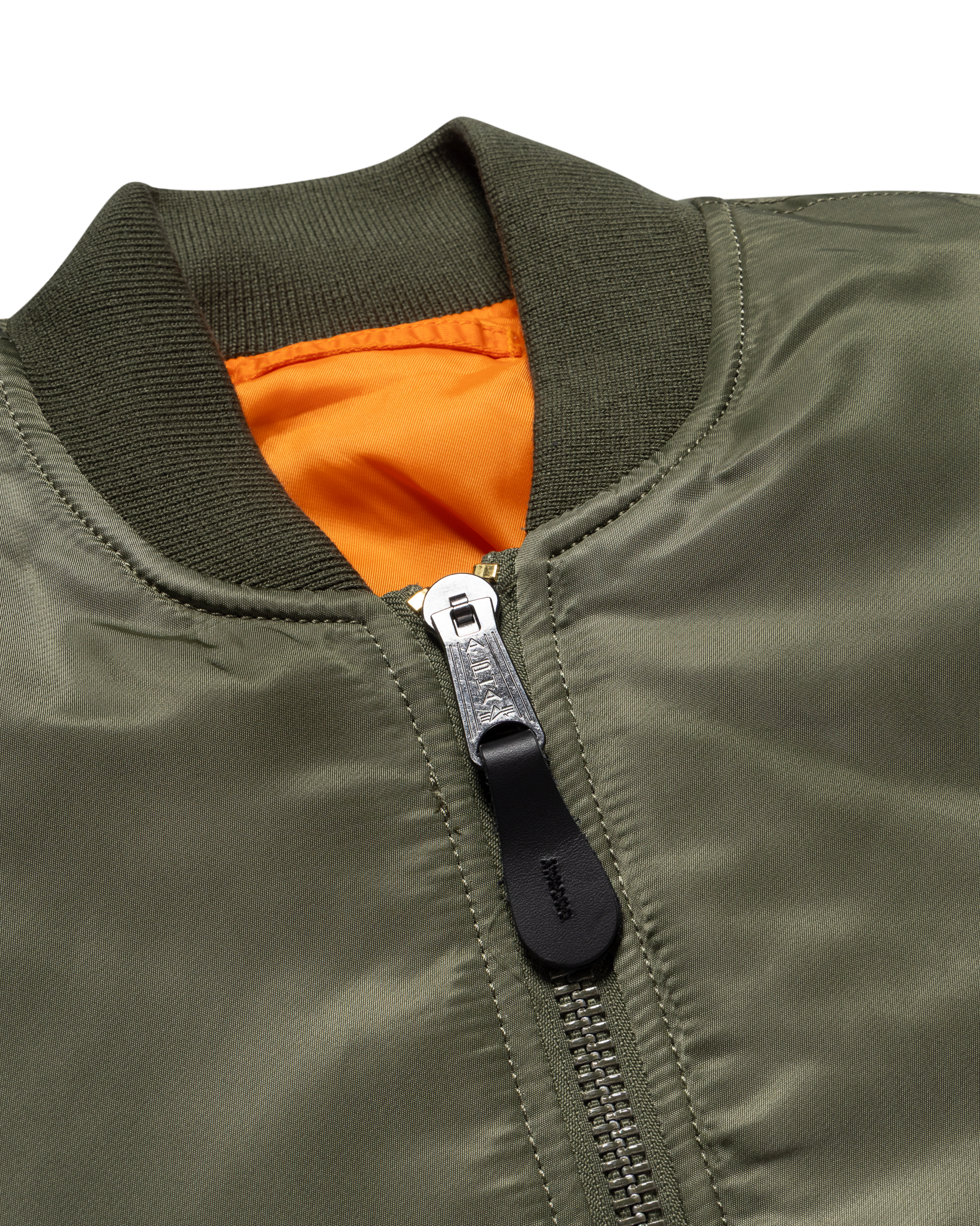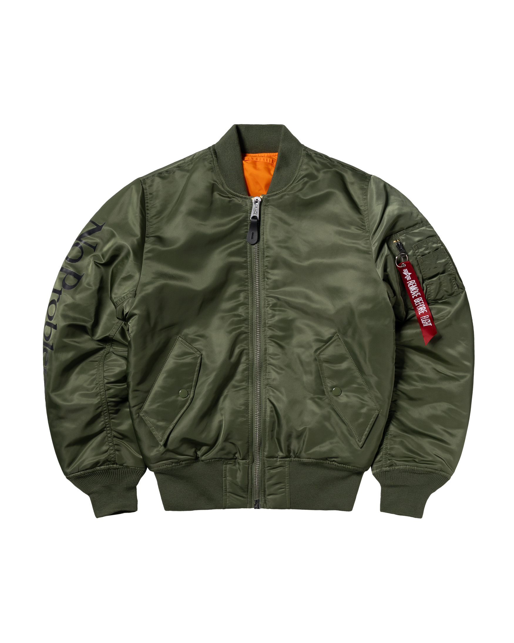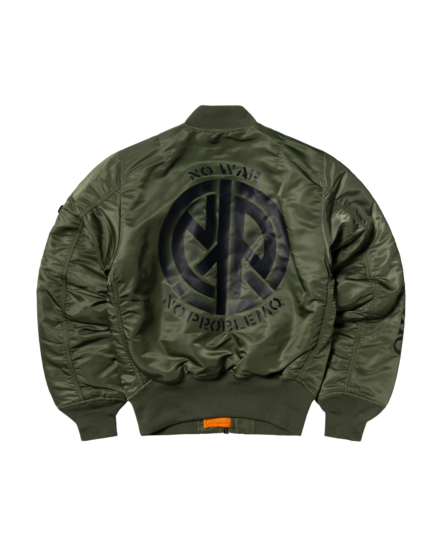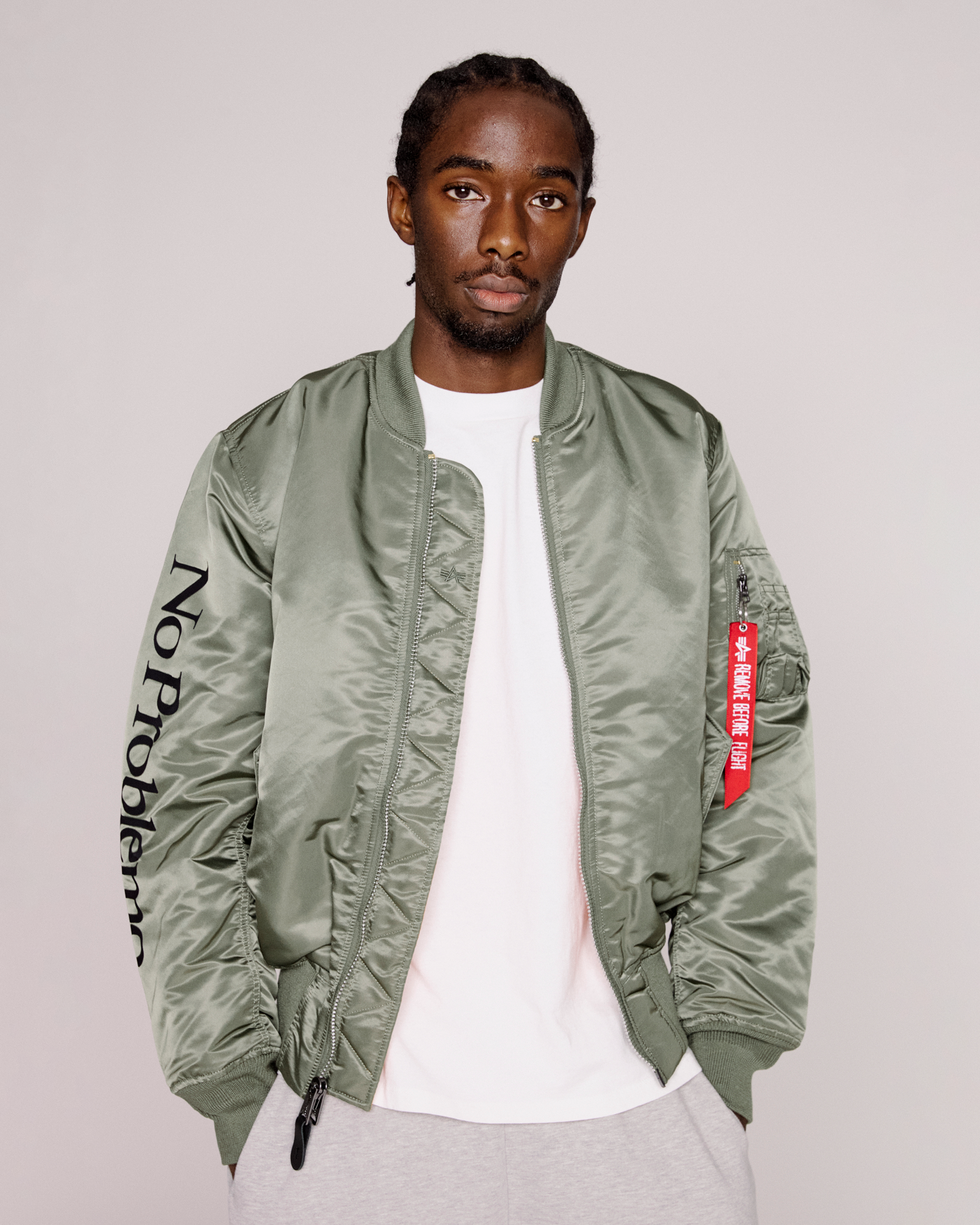 alpha Industries partners with no problemo to rework the ma-1 bomber jacket. the alpha industries x no problemo ma-1 lands in classic sage green and black. The collab is built on Alpha’s original ma-1 silhouette filtered through No Problemo’s irreverent lens.