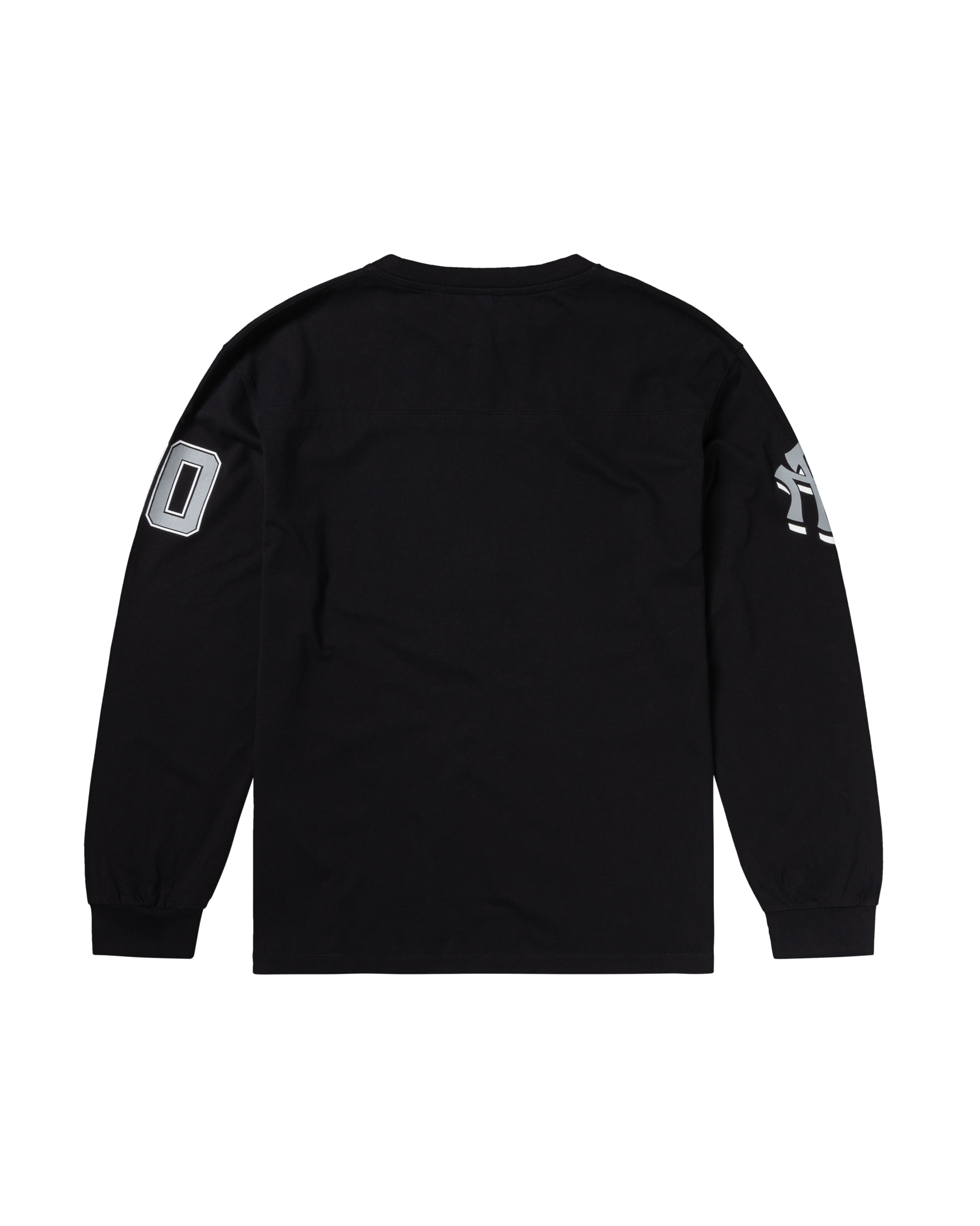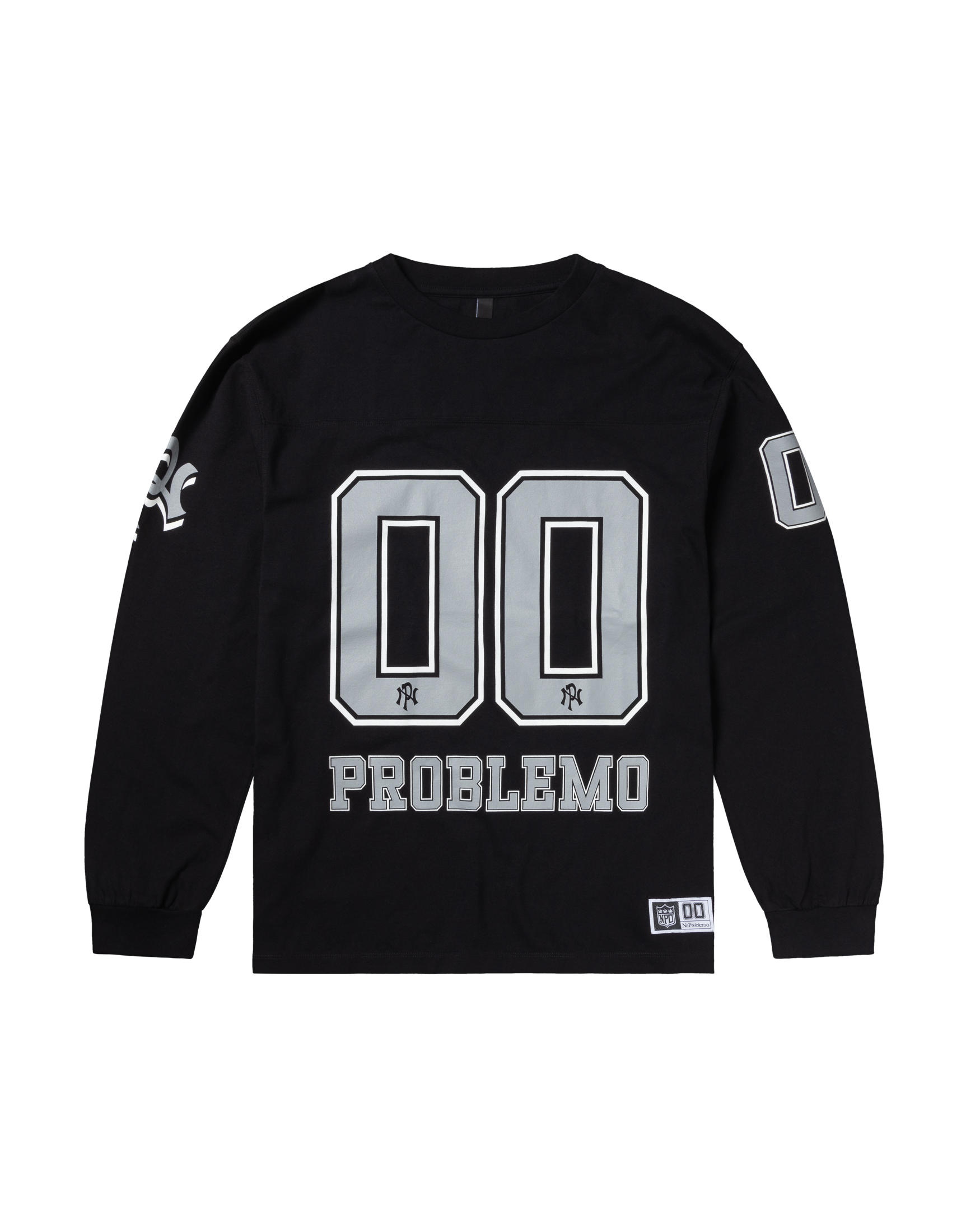 cotton sport jersey long sleeve t-shirt with 'zero problemo' graphic print on the front and sleeve, featuring branded label on the front.