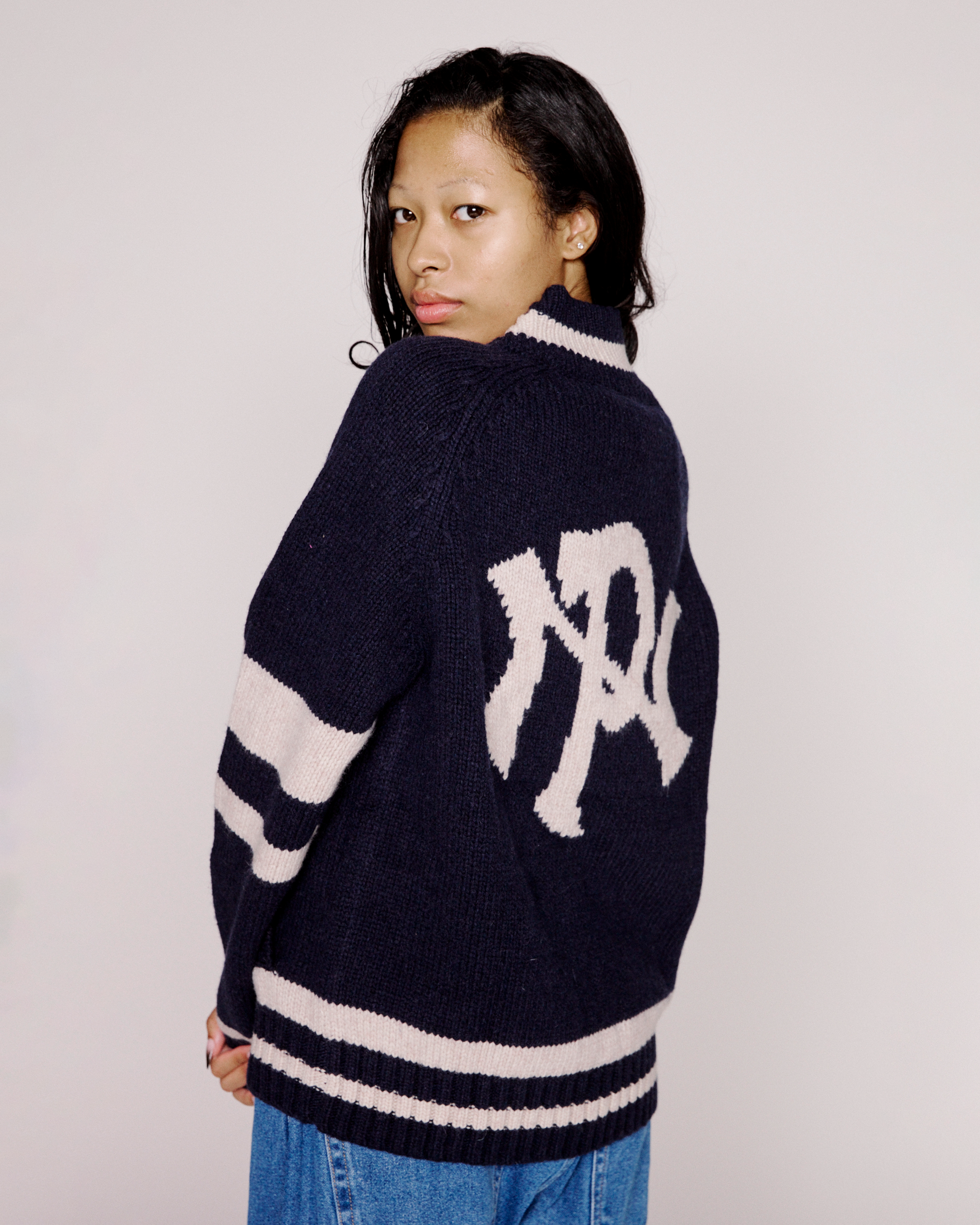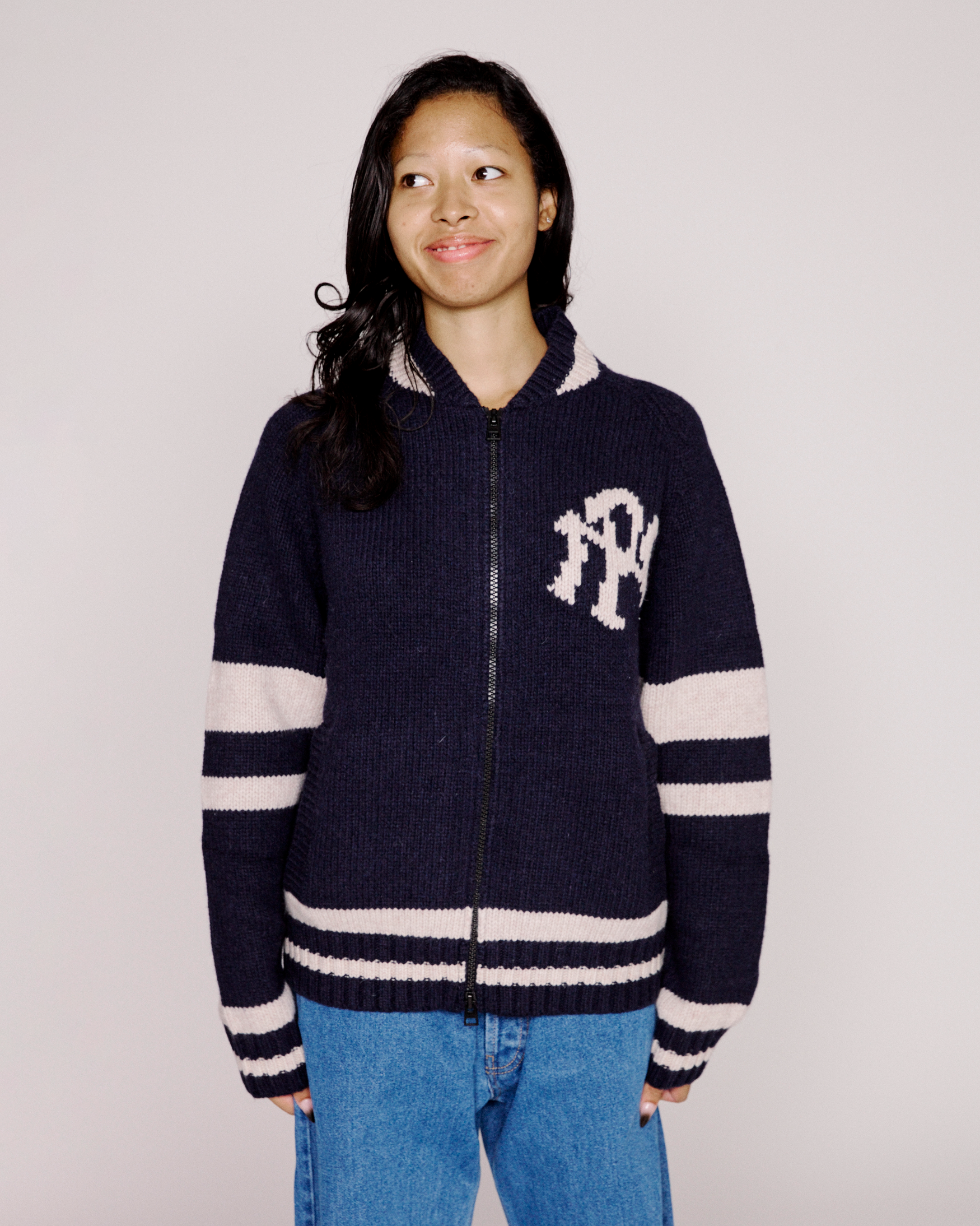 zip-through collegiate-style chunky knit in wool mix yarn.