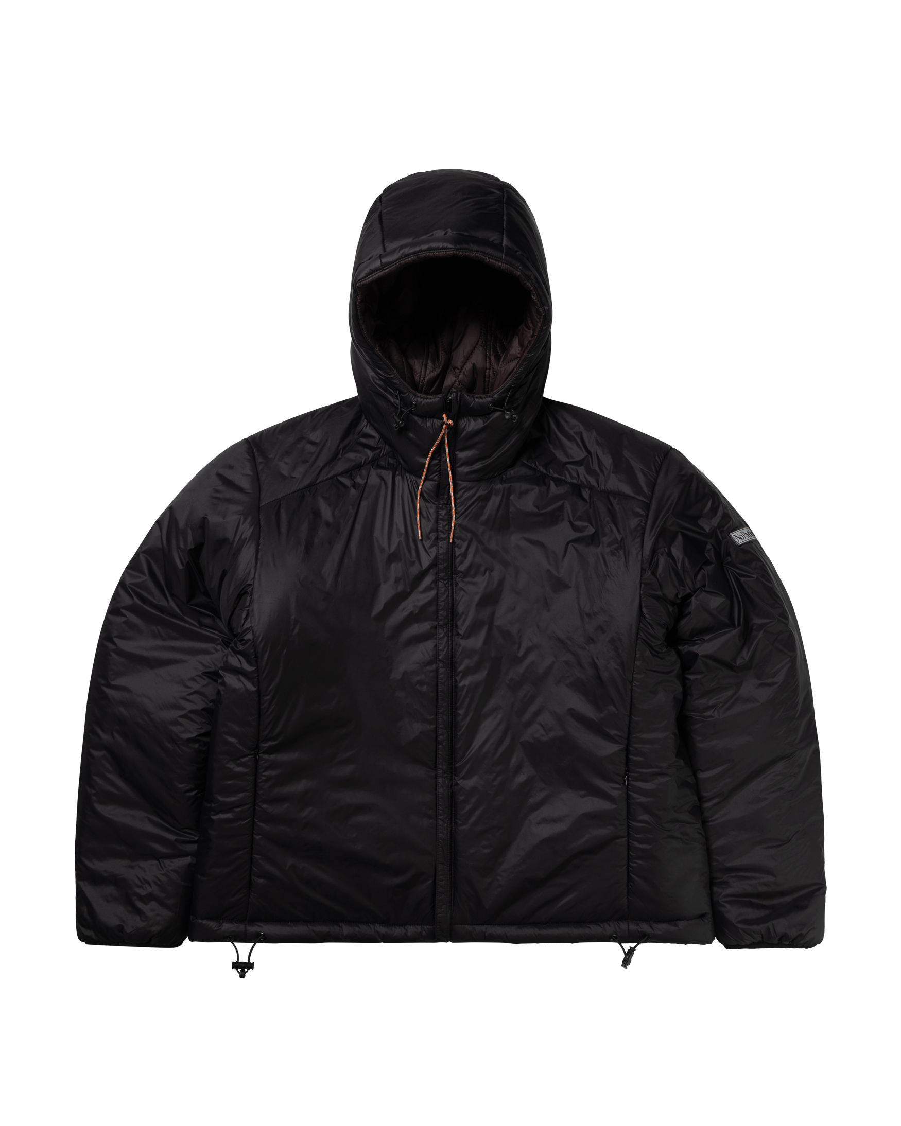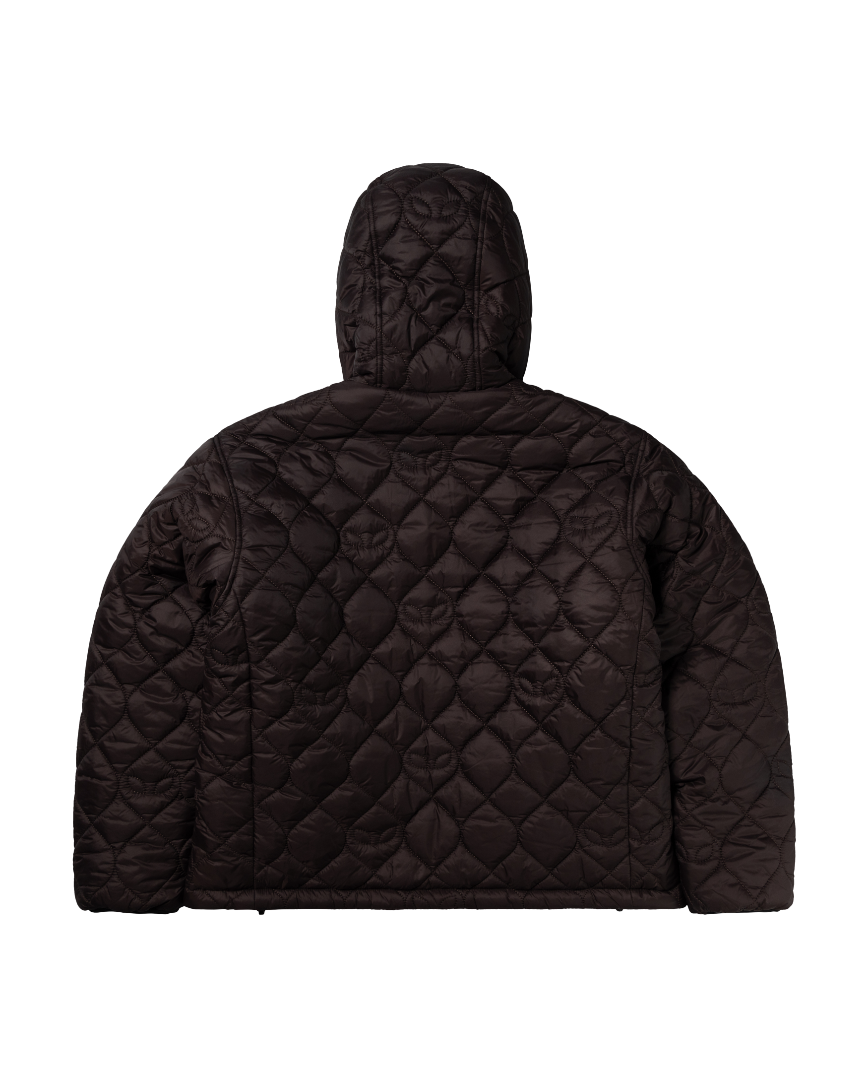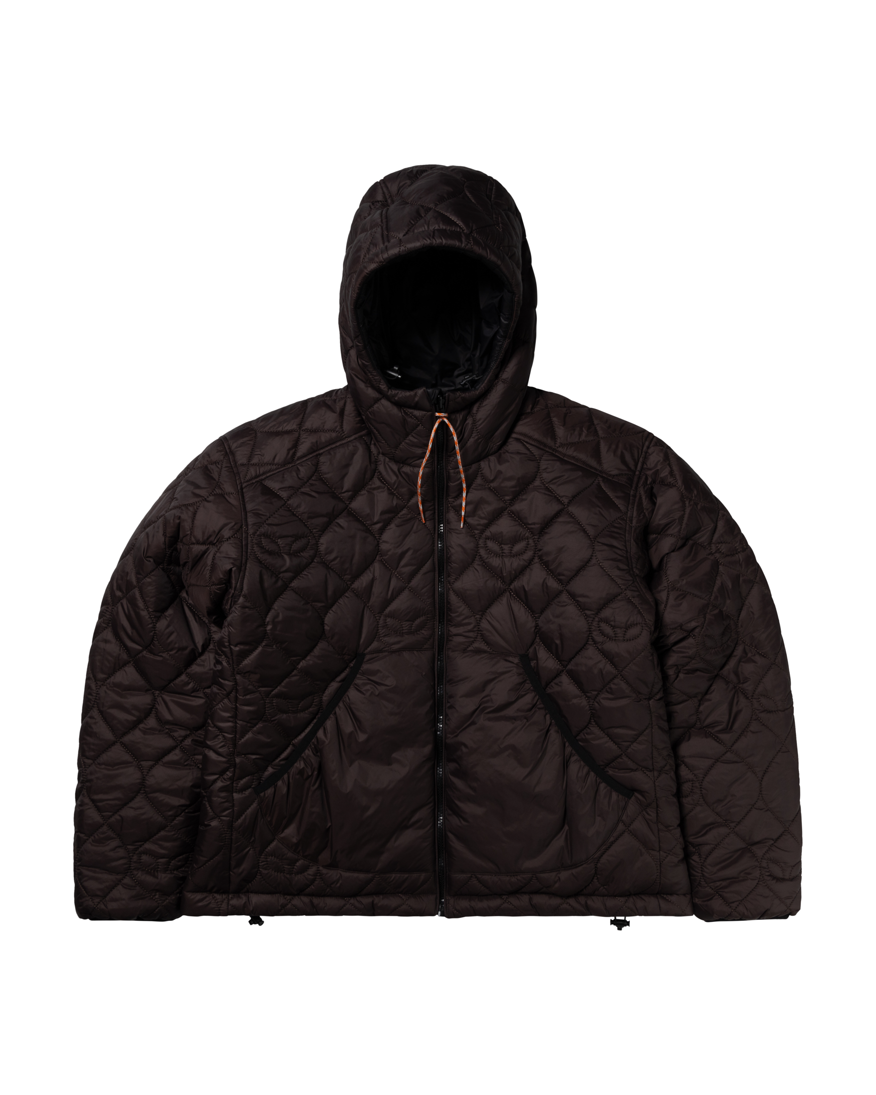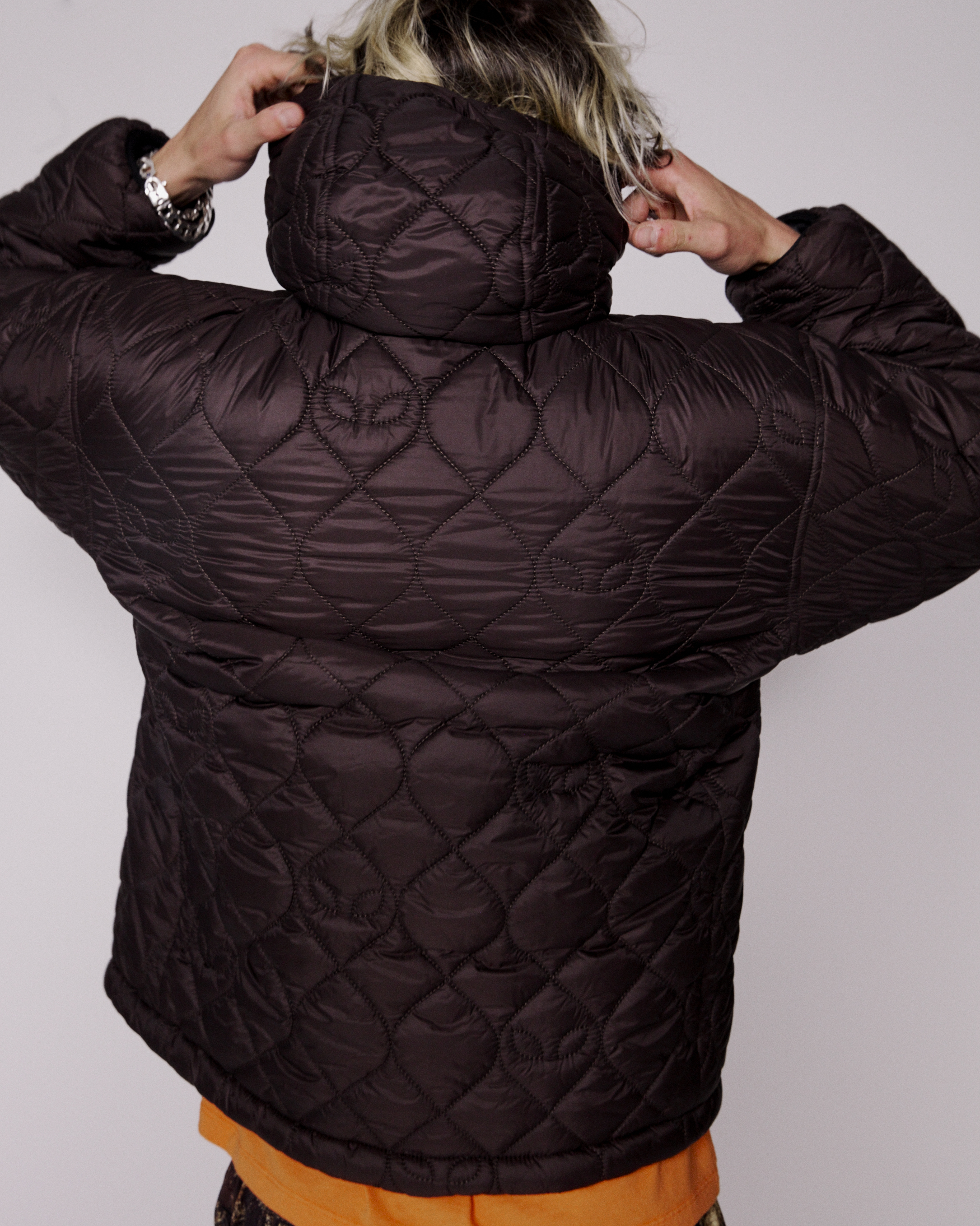 unisex hooded puffer jacket with padded alien-o stitch detailing, fully reversible with brown on one side and black on the reverse.