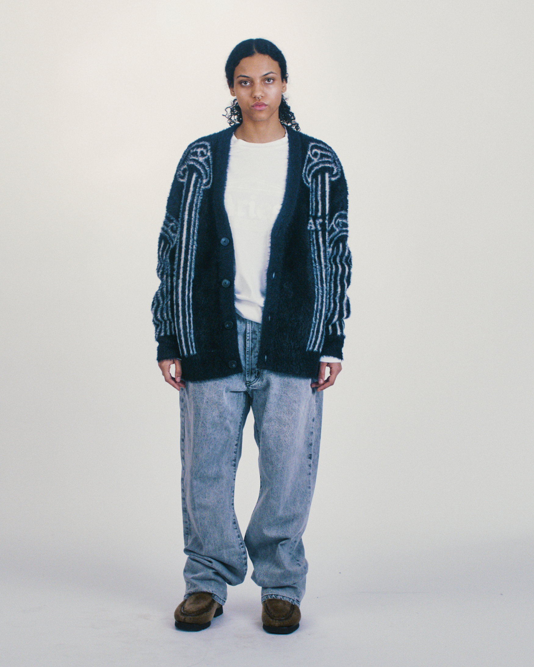 Unisex oversized 7 gauge knit cardigan, made with a fluffy chenille yarn as the main yarn. 2 colour column jacquard design on sleeves, front and back. 50% viscose 28% polyester 22% nylon.