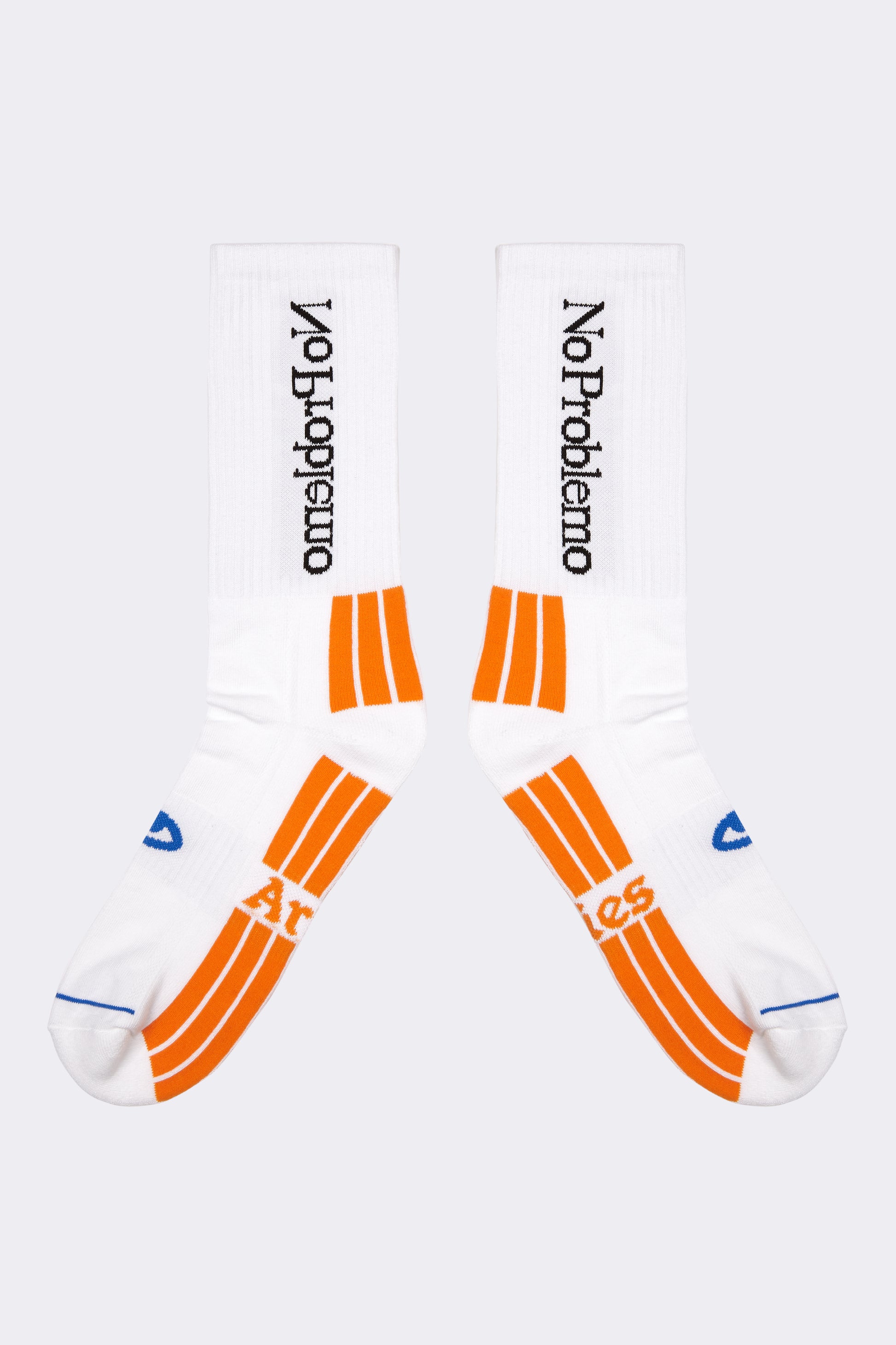 White sports socks in a cotton/performance fabric blend featuring an array of Aries graphics.