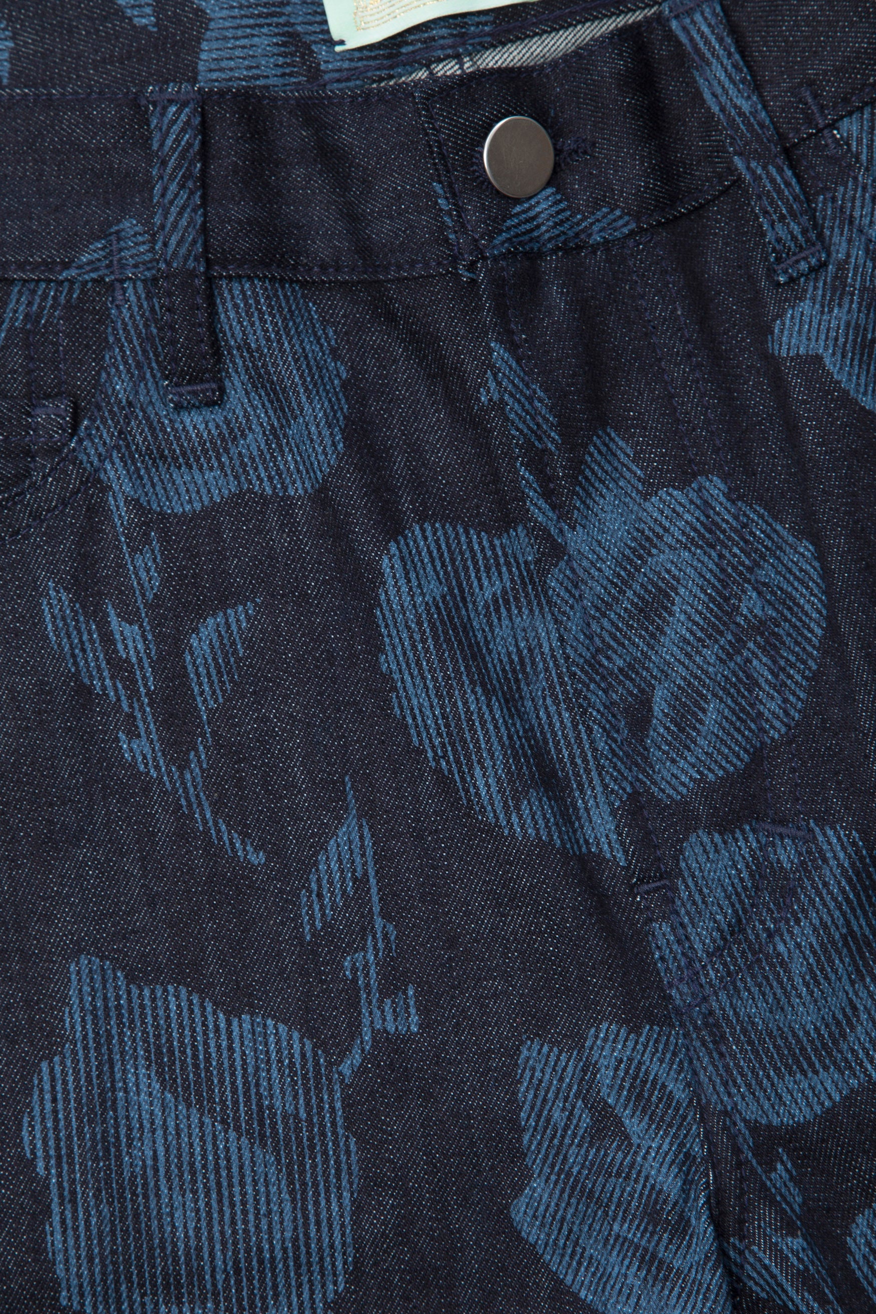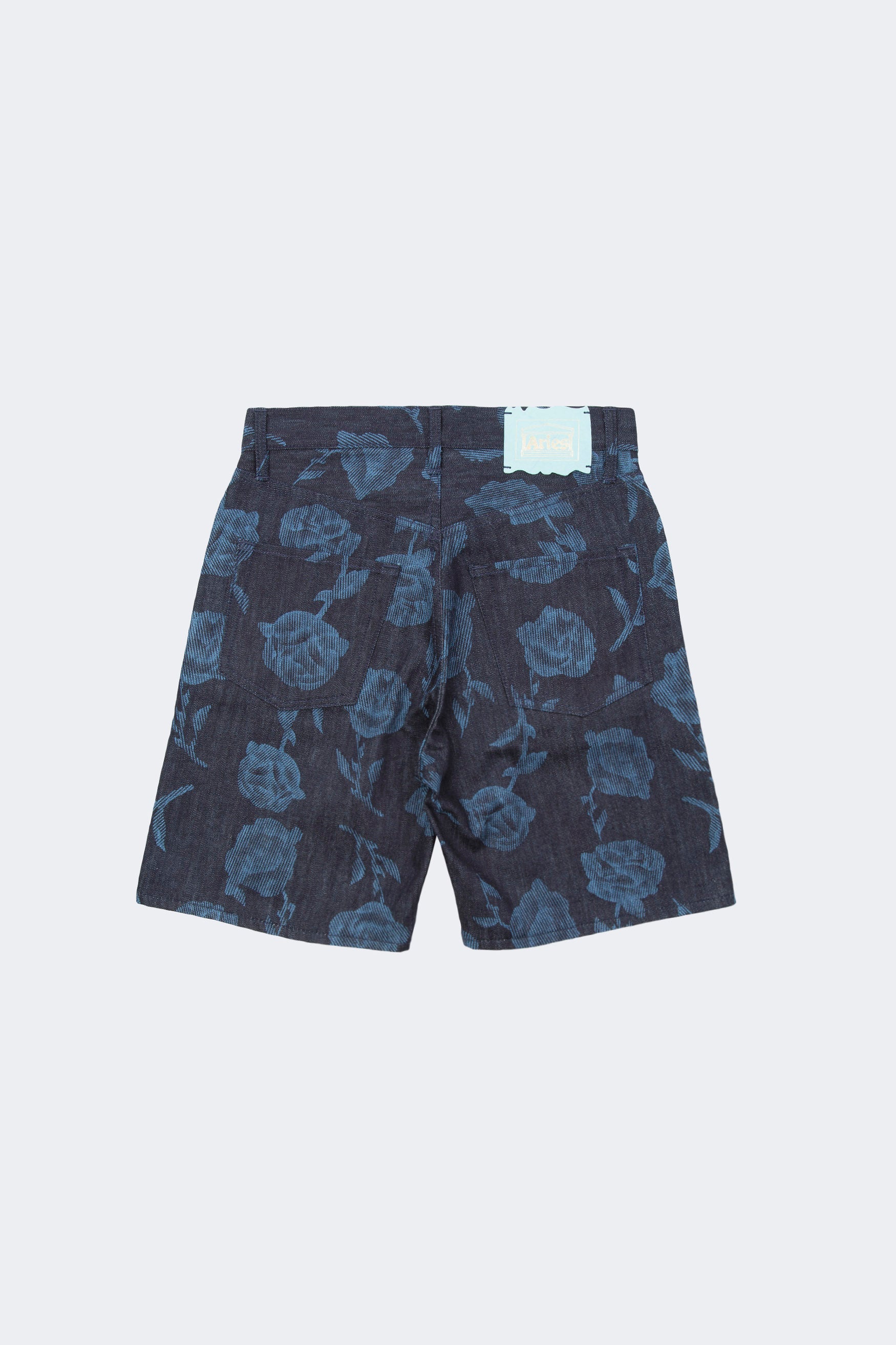 Unisex regular fit denim shorts with allover techno pagan Rose discharge print.