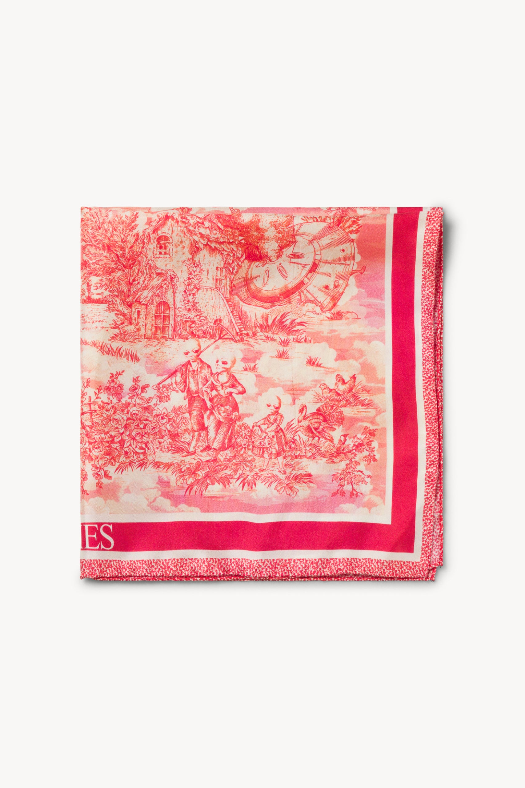 Digitally printed scarf in premium 100% silk twill with toile de Jouy design.