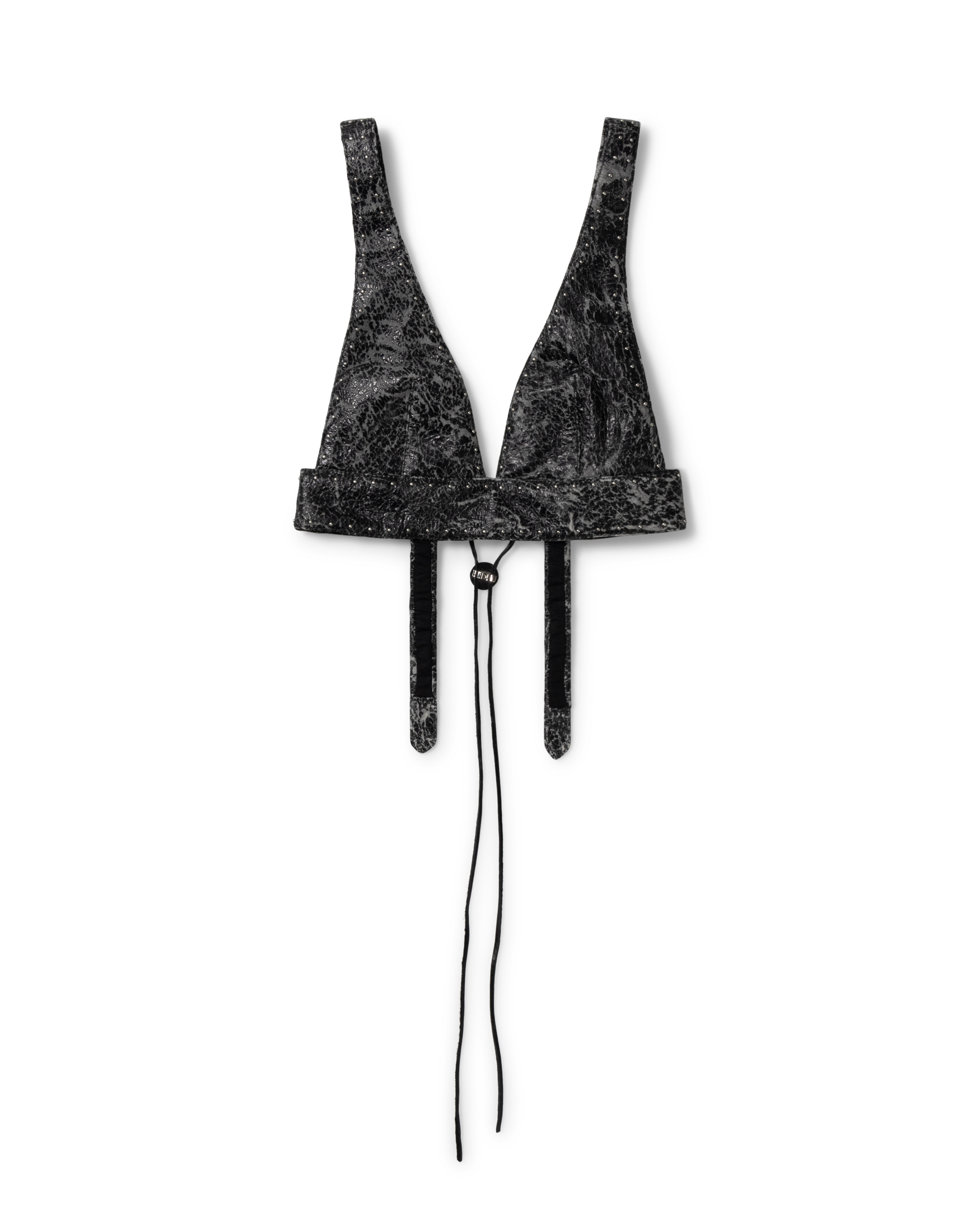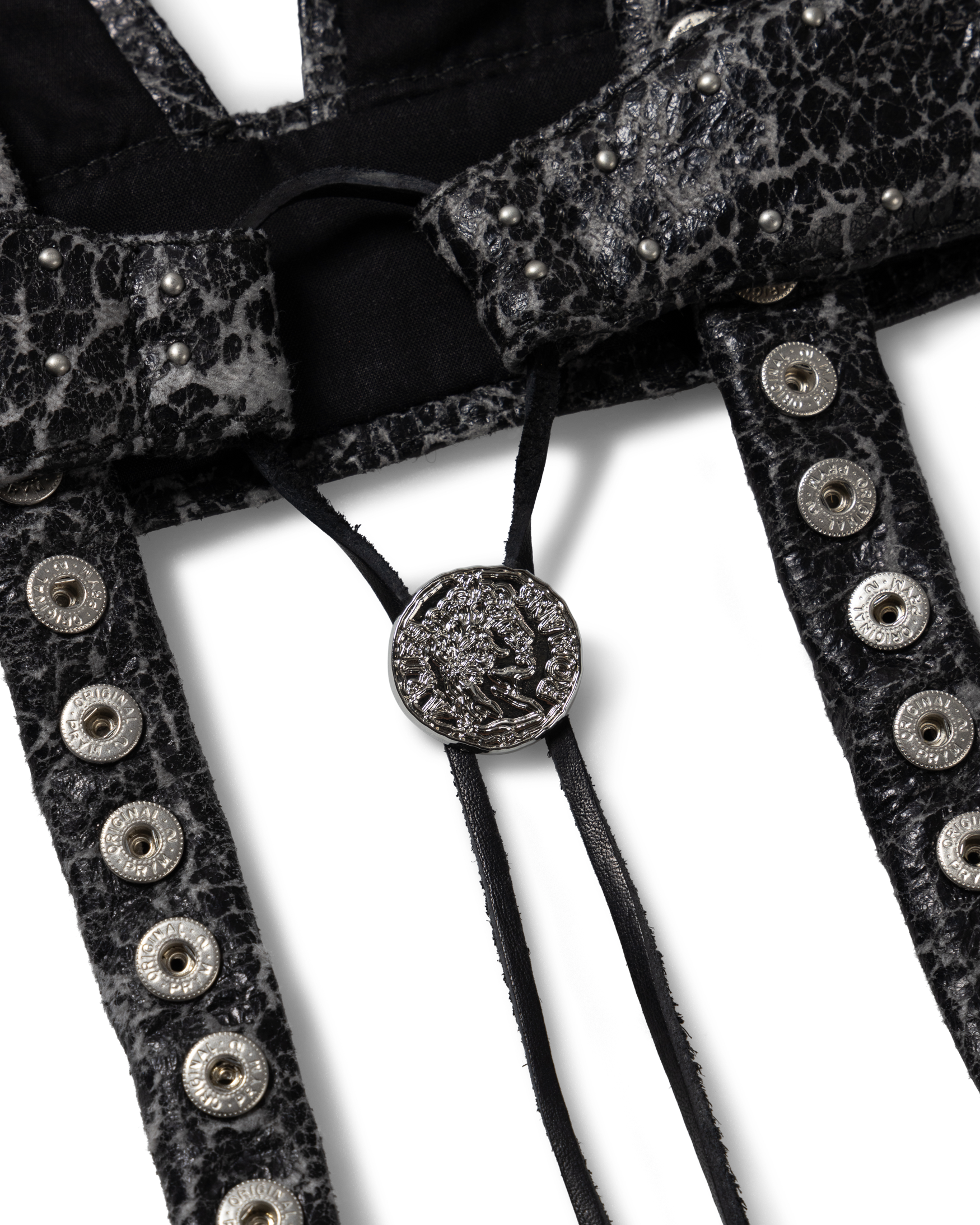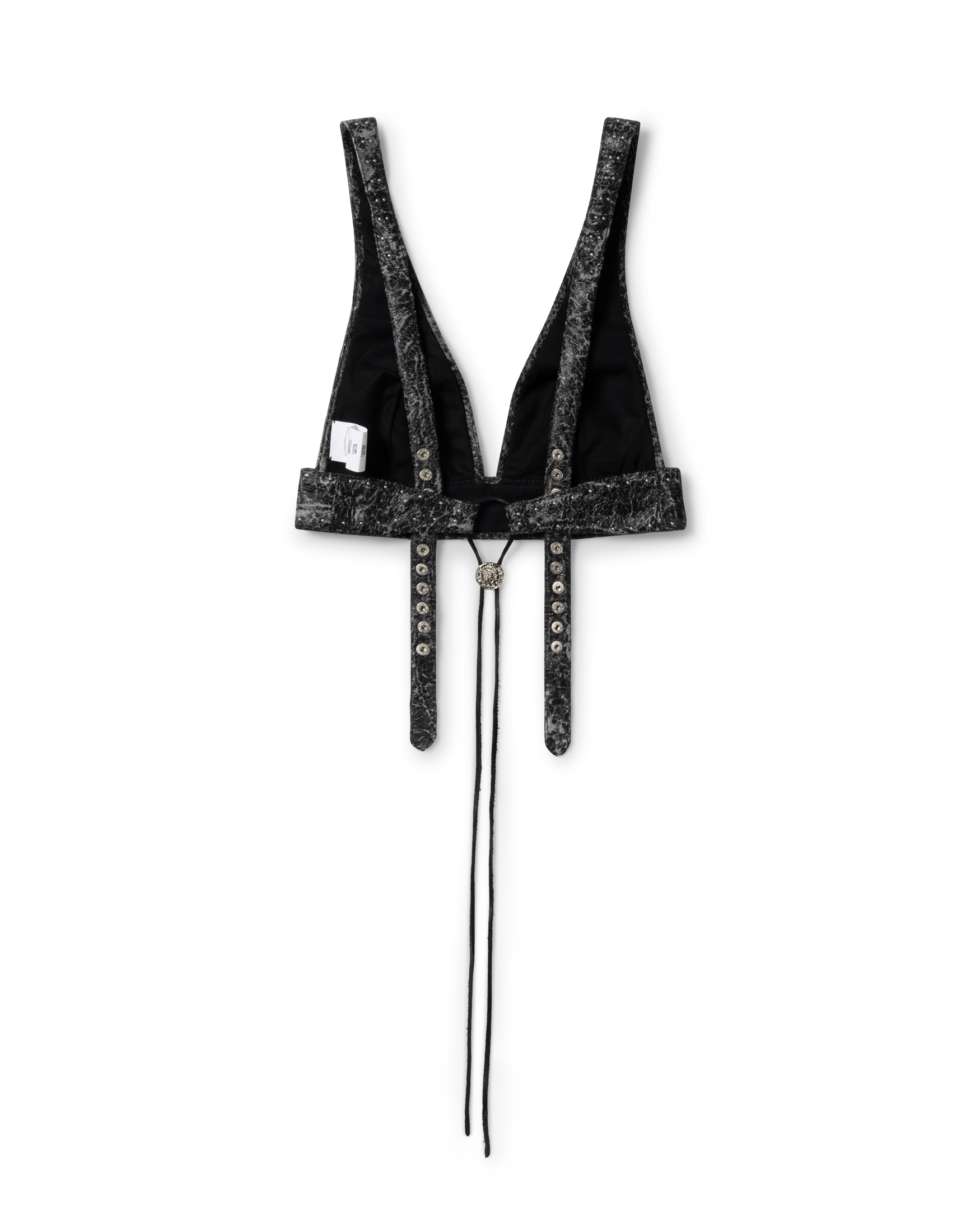 Bralette in a vintage-look 'cracked' leather with adjustable stud straps and studded detail. Featuring Aries Roman Coin 'bolo tie' fastening at the back. Made in Italy.