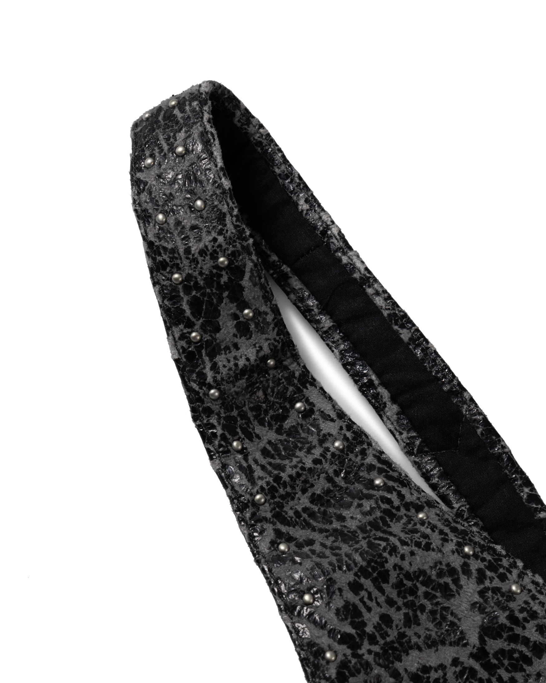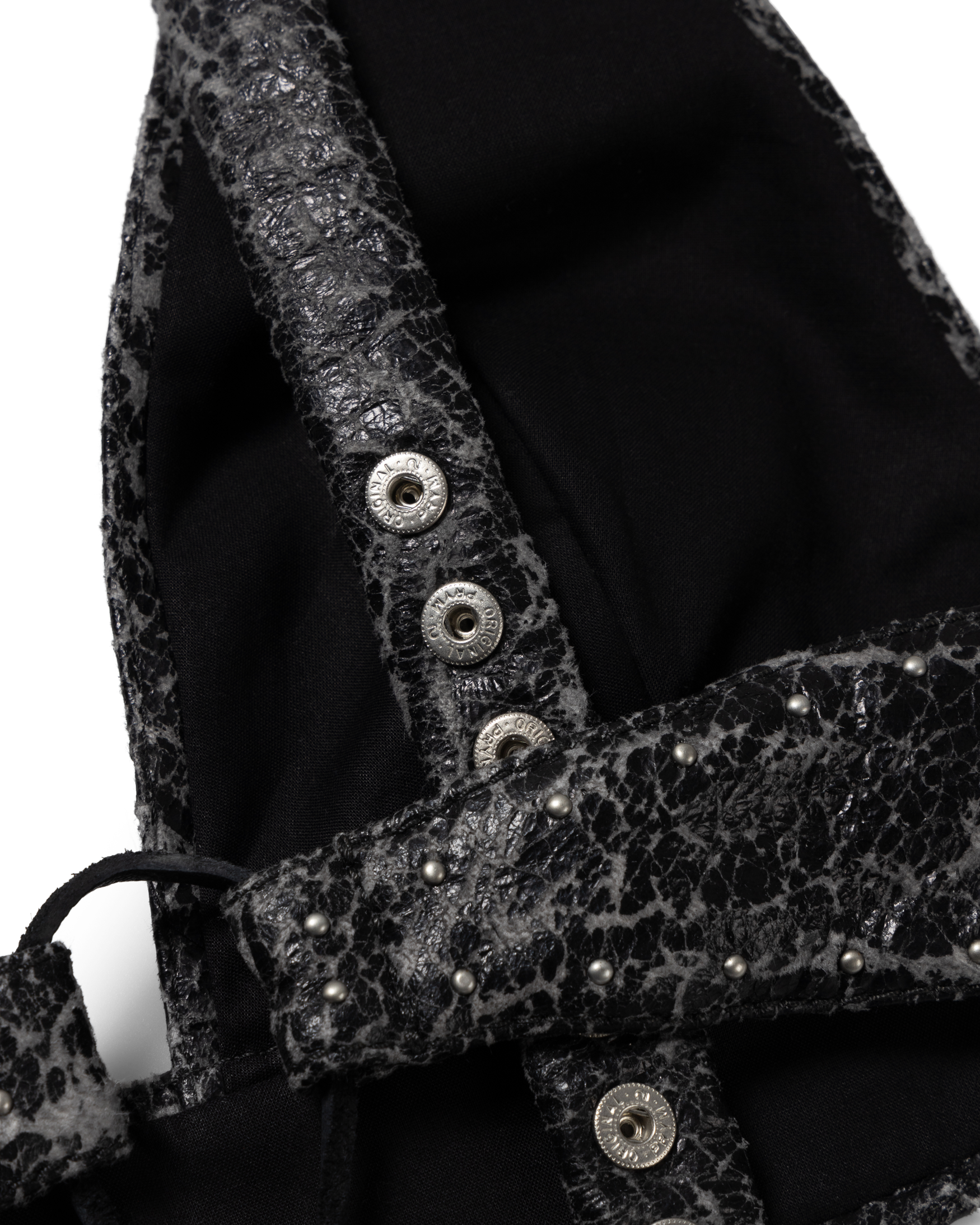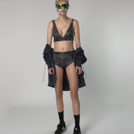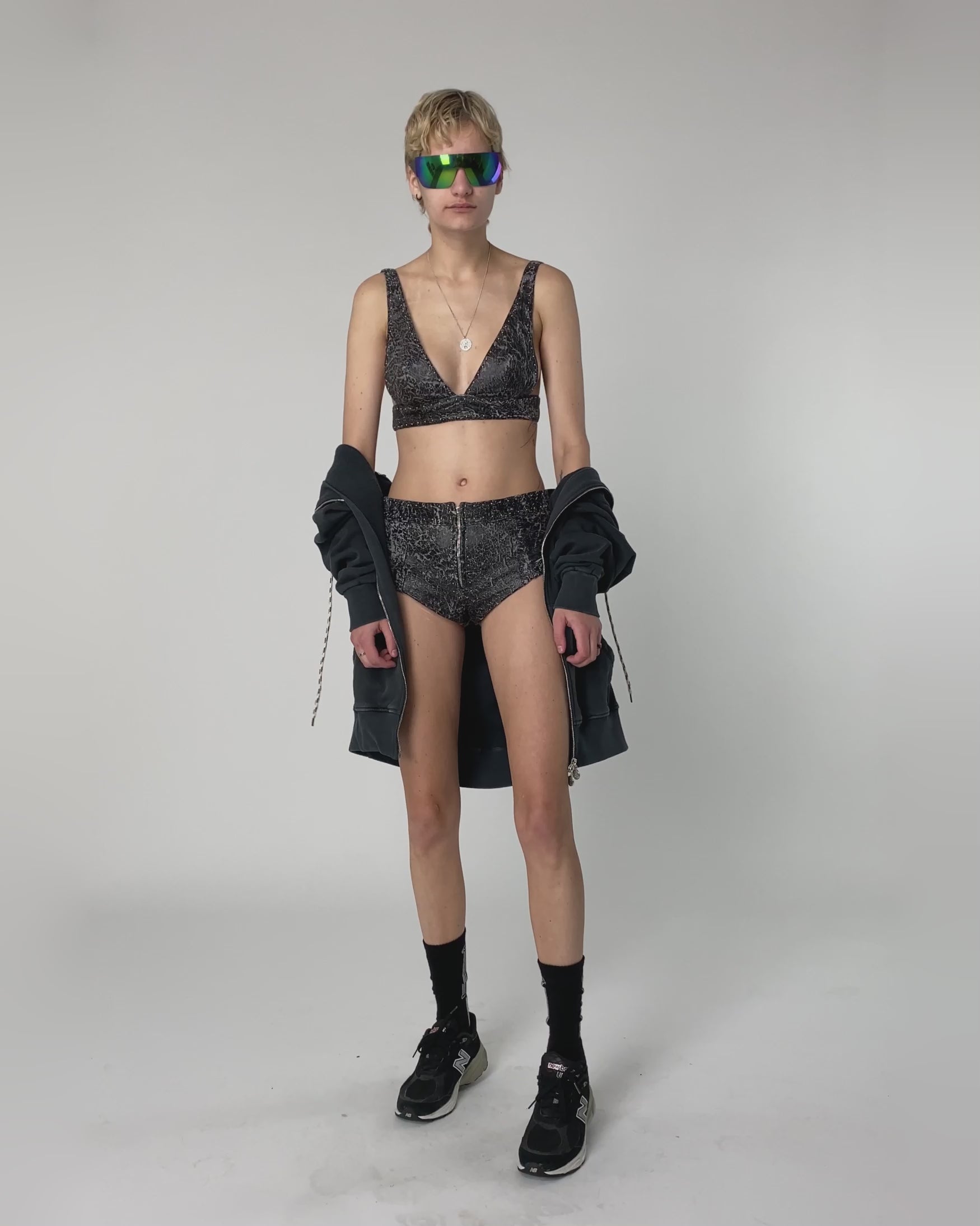Bralette in a vintage-look 'cracked' leather with adjustable stud straps and studded detail. Featuring Aries Roman Coin 'bolo tie' fastening at the back. Made in Italy.