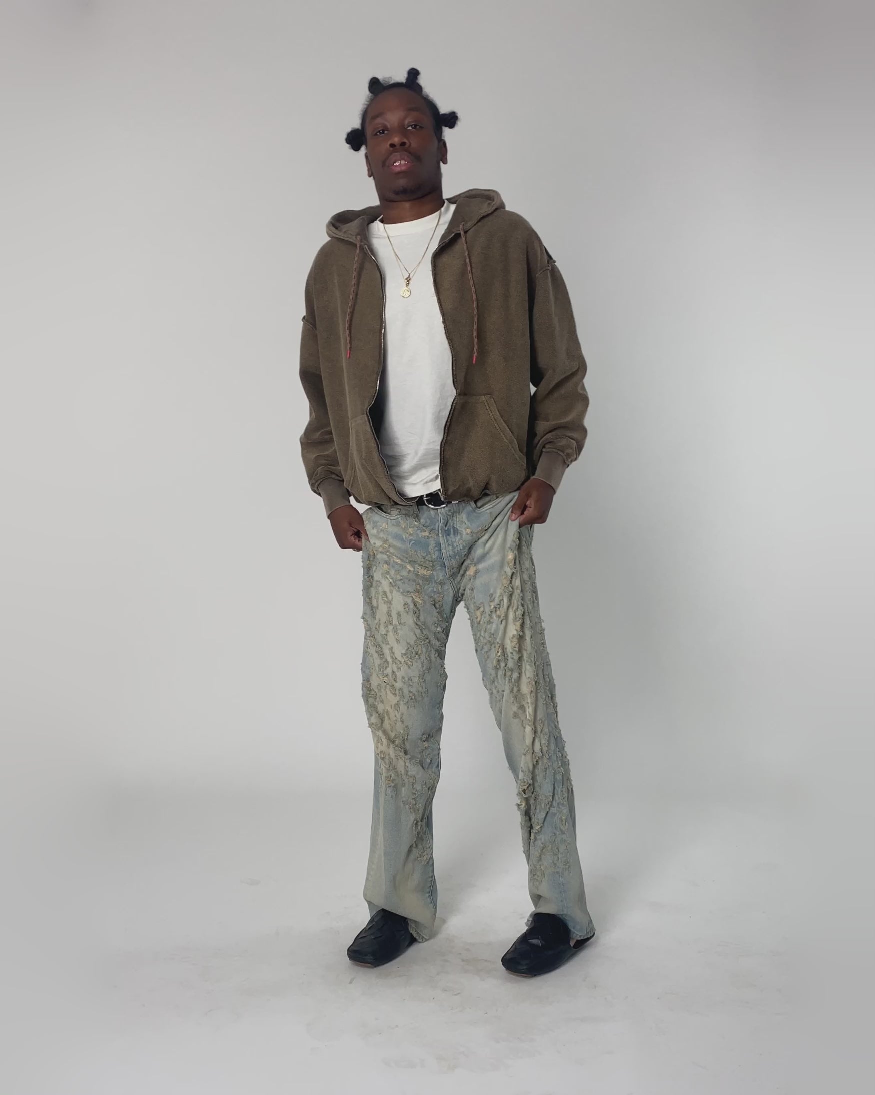 Unisex '90s-style Skate jeans, meant to be worn super baggy. Made from cotton indigo denim treated with a lasered allover lace graphic and uneven stone wash.