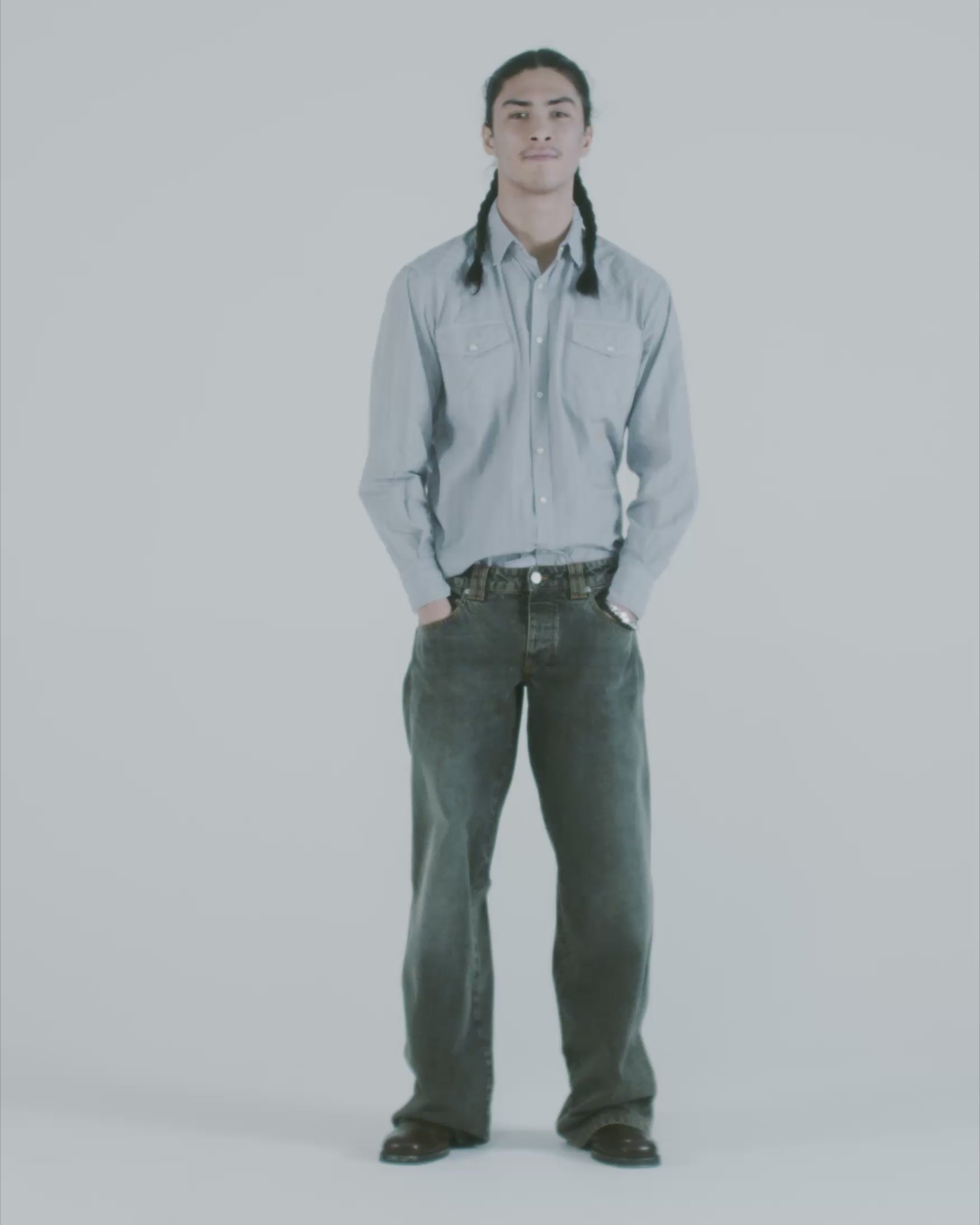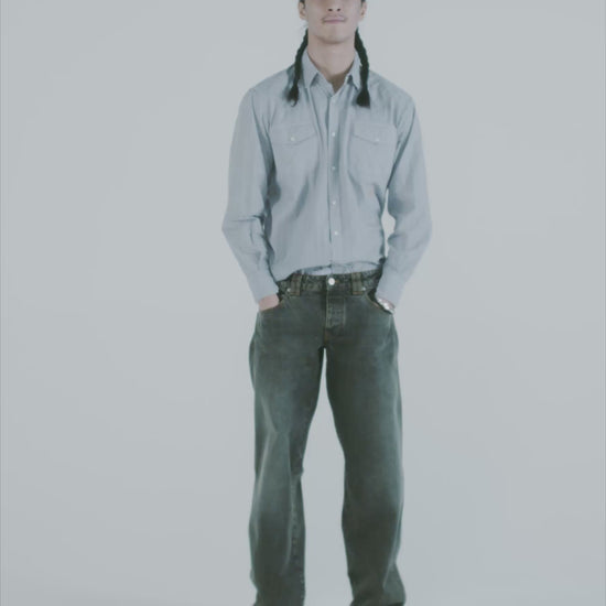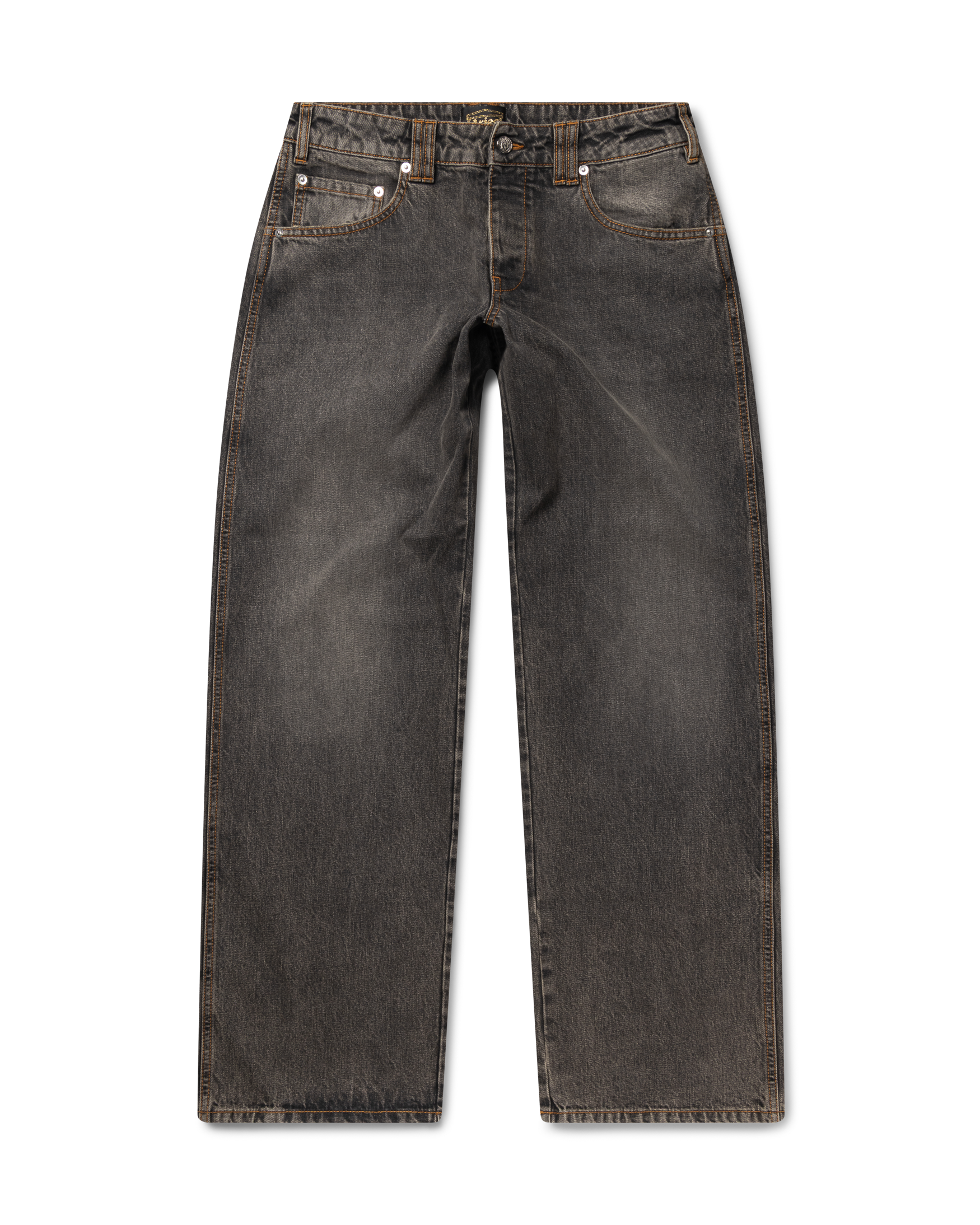 Unisex five pocket wide leg jean made from 100% cotton denim with vintage distressed wash, a dirty tint overdye and a leather temple patch.