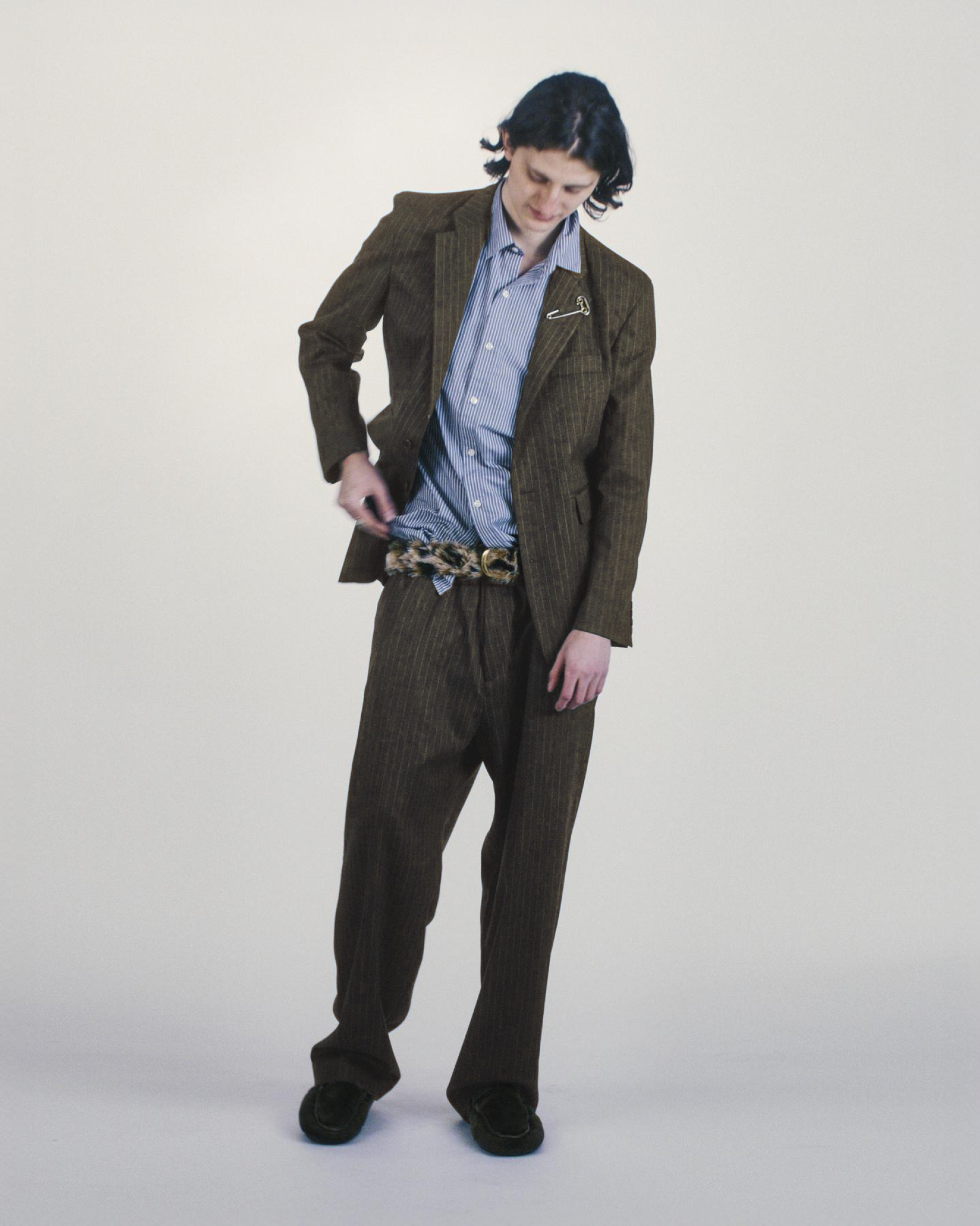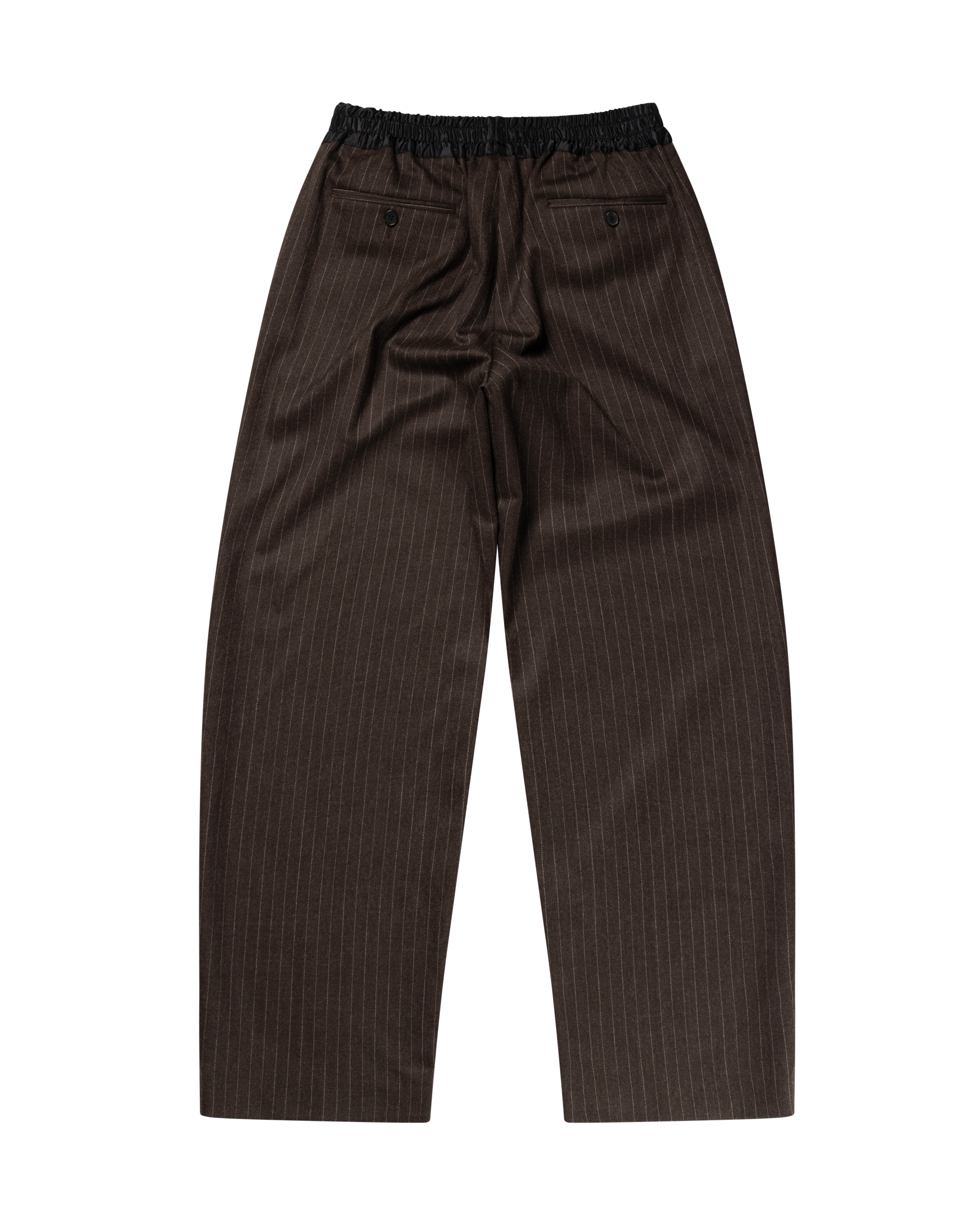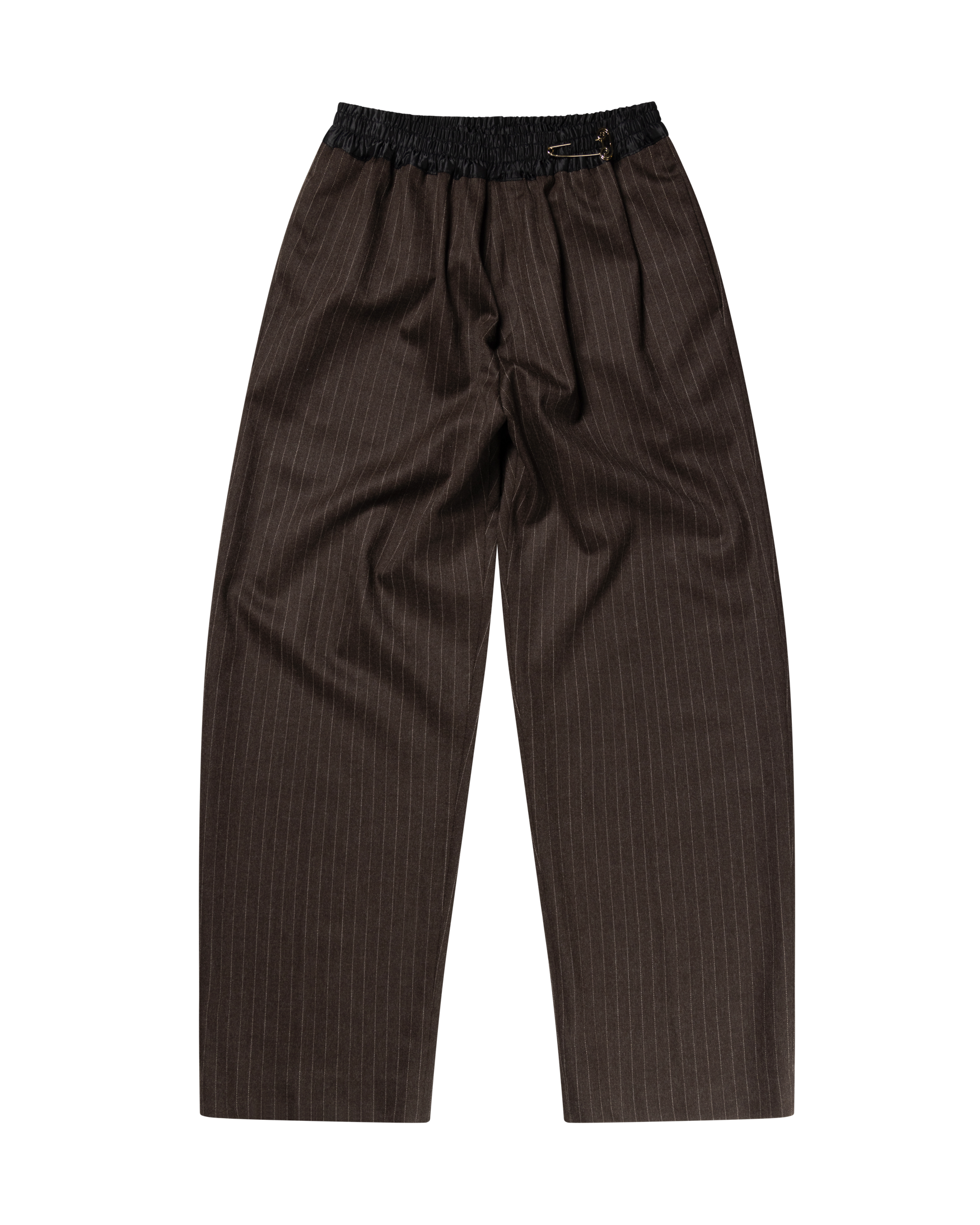 ARIES EXCLUSIVE Wool tailored trousers with an drawcorded elasticated waistband in brown with a contrast pinstripe. with custom zips on the ankles and Aries Column safety pin detail on the waistband. 98% wool, 2% elastane.