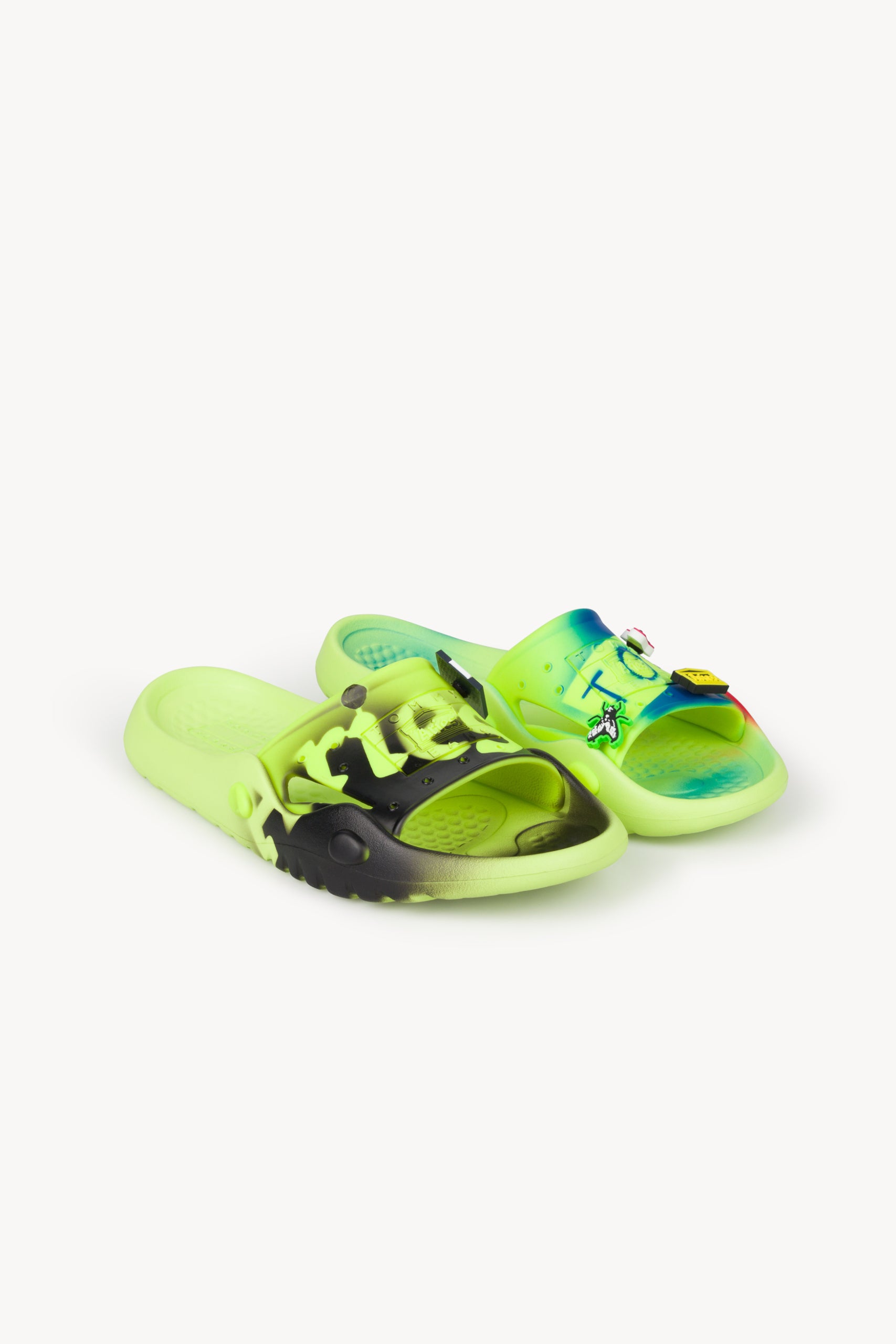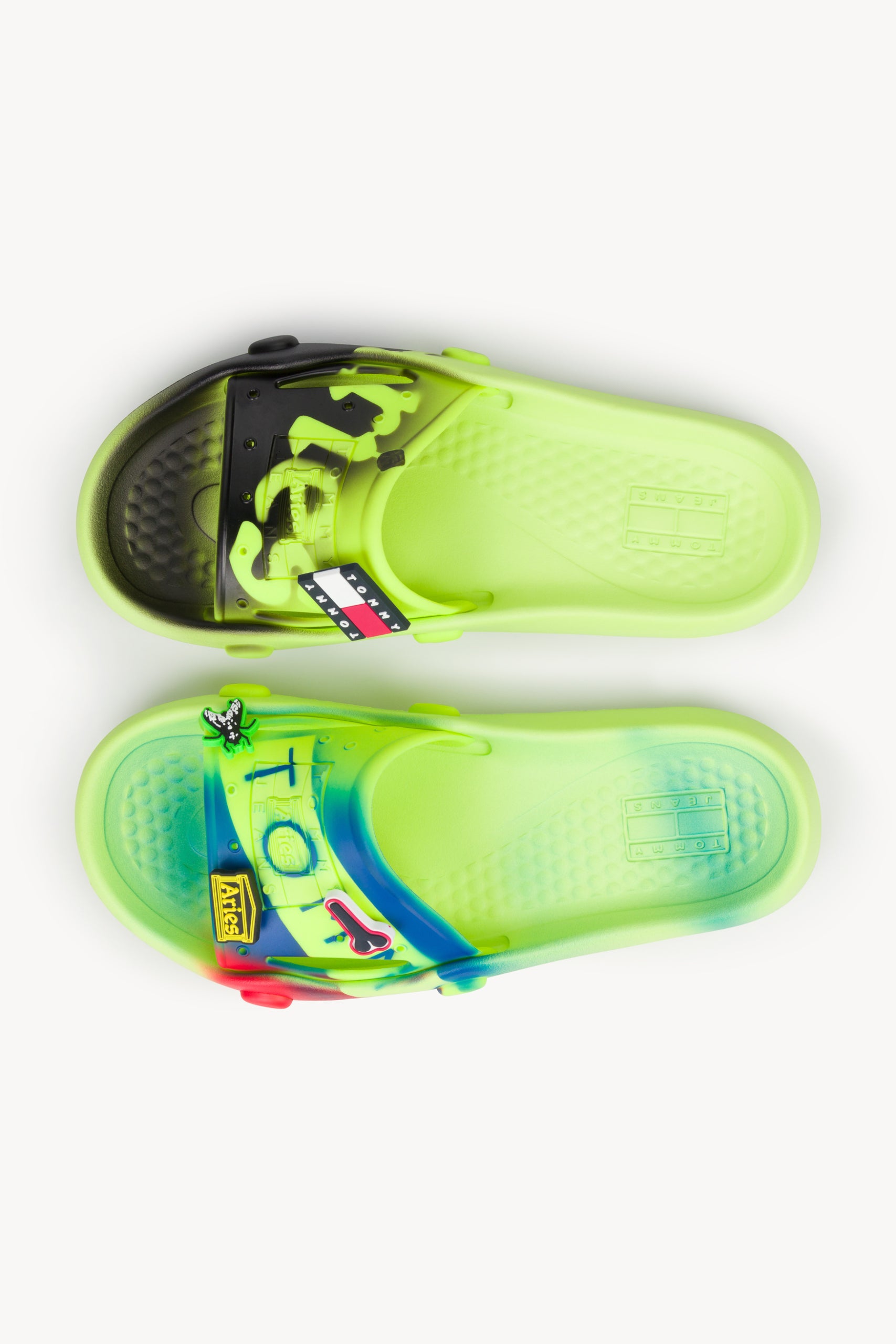 Taken from the Tommy archive and hacked with the Aries aesthetic, this moulded pool slider in safety yellow has been given a diy edge with stencil-style Tommy x Aries collaboration logos.